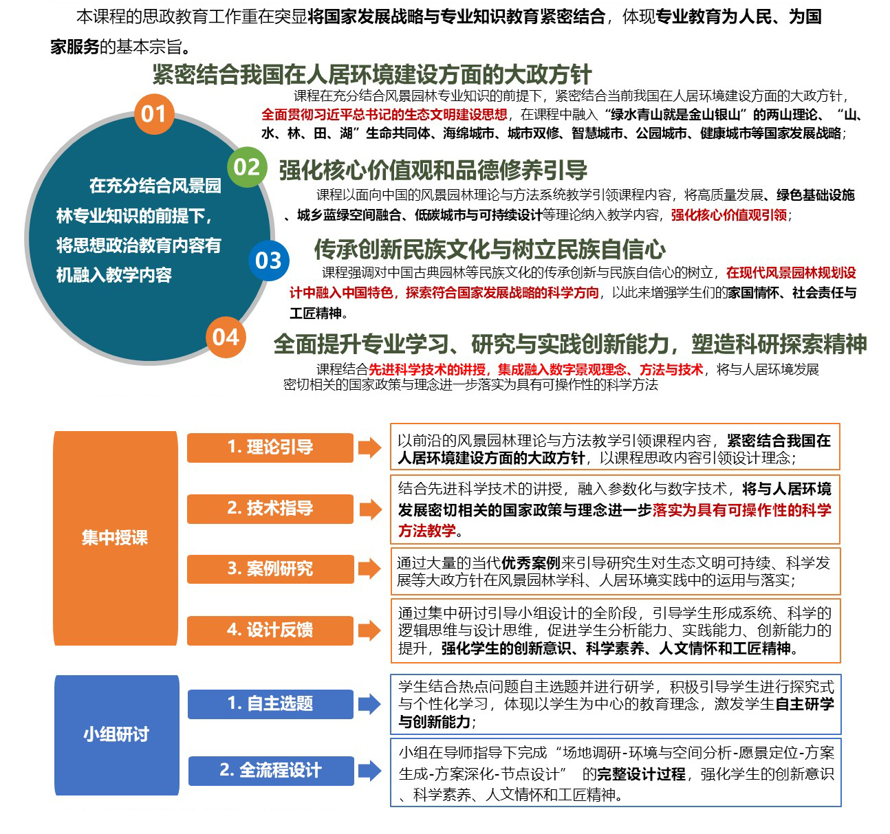 课程以习近平新时代中国特色社会主义思想为指导,铸牢“四个意识”,坚定“四个自信”,坚持具有中国特色的生态文明发展观,秉持科学与艺术相结合、定性与定量相结合的景园设计方法论,建立针对国土与环境、民族与文化特点的景园规划设计技术体系,实现以“耦合法”为代表的景园规划设计教学方法创新,集成融入数字景观理念、方法与技术,基于7项国家发明专利进行“数据信息-空间信息”定位耦合技术、参数化风景园林适宜性分析技术、规划设计综合调控技术的教学应用,实现了风景园林调查分析、规划设计的原创性技术突破,课程内容融入“绿水青山就是金山银山”的两山理论、“山、水、林、田、湖”生命共同体、海绵城市、城市双修、智慧城市、公园城市、健康城市等国家发展战略,全过程应用于风景园林规划设计教学中成效显著、具有技术领先意义。