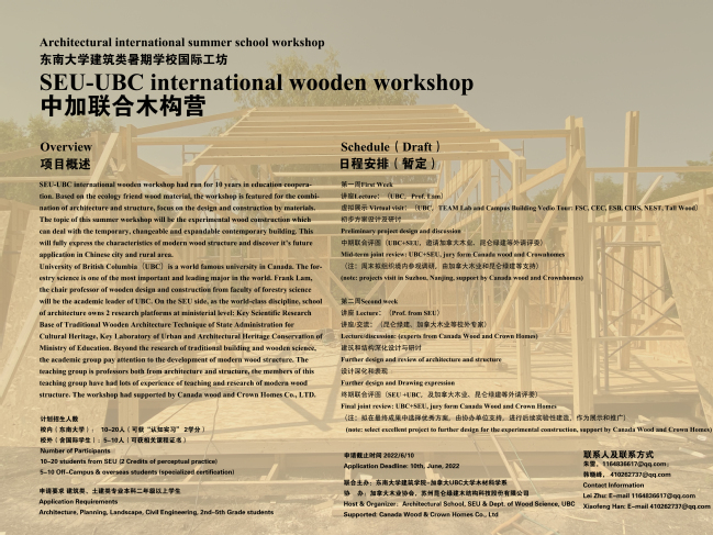 University of British Columbia(UBC)is a world famous university in Canada. The forestry science is one of the most important and leading major in the world. Frank Lam, the chair professor of wooden design and construction from faculty of forestry science will be the academic leader of UBC. On the SEU side, as the world-class discipline, school of architecture owns 2 research platforms at ministerial level: Key Scientific Research Base of Traditional Wooden Architecture Technique of State Administration for Cultural Heritage, Key Laboratory of Urban and Architectural Heritage Conservation of Ministry of Education. Beyond the research of traditional building and wooden science, the academic group pay attention to the development of modern wood structure. The teaching group is professors both from architecture and structure, the members of this teaching group have had lots of experience of teaching and research of modern wood structure. The workshop had supported by Canada wood and Crown Homes Co., LTD. For Architecture, Planning, Landscape, Civil Engineering, 2nd-5th Grade students,after registration and passing the examination, the students can get 2 credits of cognitive practice ; off campus students can obtain relevant course certificates.