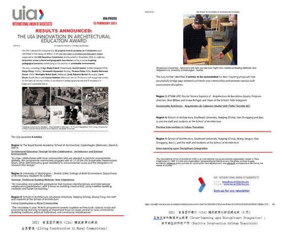 图19 中外联队作品获得2019国际建协高校建造大赛一等奖现场及部分国际媒体报道