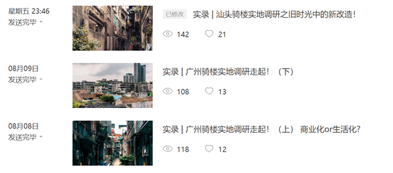 我们制作了一系列骑楼建筑主题的明信片作为采访活动的小礼品和周边宣传,调查的各骑楼街区和特色骑楼建筑均有照片记录,并将部分采访过程录制成视频。我们还创建了一个微信公众号,用以进行相关知识的推广普及和成果的展示。最终成果以一份图文并茂的报告形式呈现。