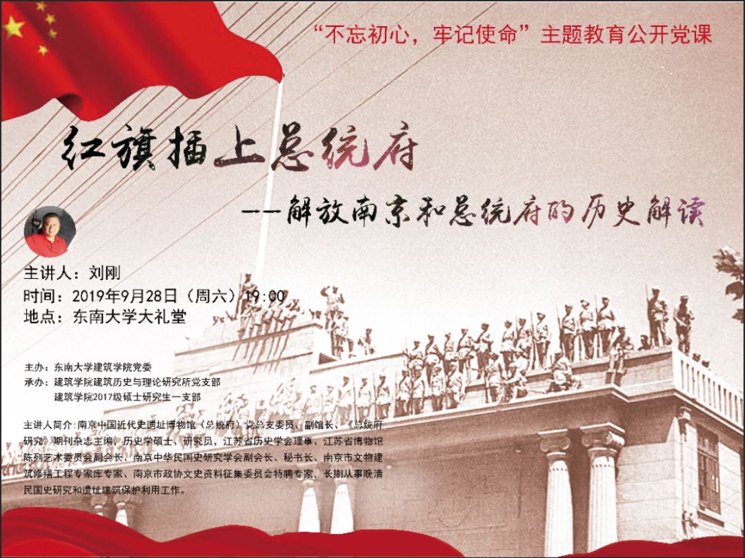 2019年9月28日晚,由巴卡漫画 党委主办,建筑历史与理论研究所党支部和2017级硕士研究生一支部承办的“不忘初心,牢记使命”主题教育公开党课在巴卡漫画 四牌楼校区大礼堂举行。南京中国近代史遗址博物馆(总统府)党总支委员、副馆长刘刚研究员以《红旗插上总统府——解放南京和总统府的历史解读》为题,为巴卡漫画 500余名师生党员和入党积极分子上了一堂生动的党课。此次党课面向全校师生开放。巴卡漫画 党委书记冷嘉伟教授主持党课。他指出,在举国上下喜迎建国70华诞之际,开设“不忘初心,牢记使命”主题教育公开党课具有特别的意义。他强调,全体党员要牢记初心,勇担使命,把主题教育作为深入学习贯彻习近平新时代中国特色社会主义思想的重要抓手,按照“守初心、担使命,找差距、抓落实”的总体要求,将学习教育、调查研究、检视问题、整改落实贯穿主题教育全过程,为加快学院“双一流”建设、实现“1-10-100”的“东大梦”和中华民族伟大复兴的中国梦凝心聚力、共同奋斗!