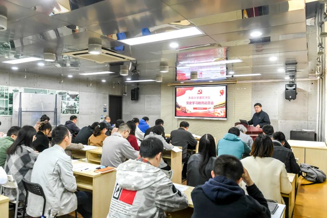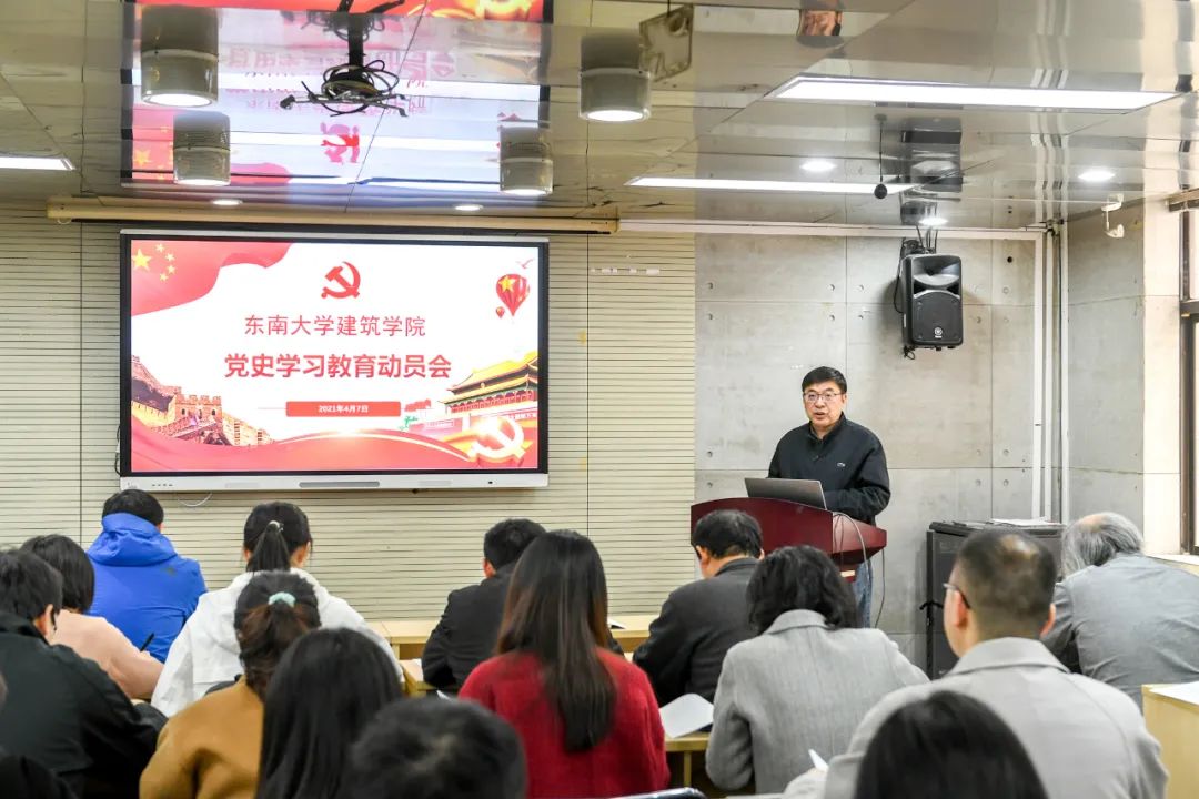 其后,冷嘉伟作了动员讲话,对学院开展党史学习教育进行动员布置。他强调,要将党史学习教育贯穿2021年全年,在党史学习教育中重点抓好以下几个方面内容:一是开展专题学习培训,各基层党支部采取“三会一课”和主题党日活动等形式,结合红色建筑、规划、景观等项目开展主题突出、特色鲜明、形式多样的学习活动。二是用好红色教育资源,通过梳理一处处建院师生参与的实例,凝练出一个个鲜活的红色故事,一砖一瓦累筑起党史教育的万里长城。学党史、颂党恩、跟党走,用红色建筑讲好党史故事,以实境党课筑牢党性教育。三是用好课堂主渠道,将党史教育融入课堂教学。四是抓好“我为师生办实事”实践活动。五是开好专题组织生活会和民主生活会。