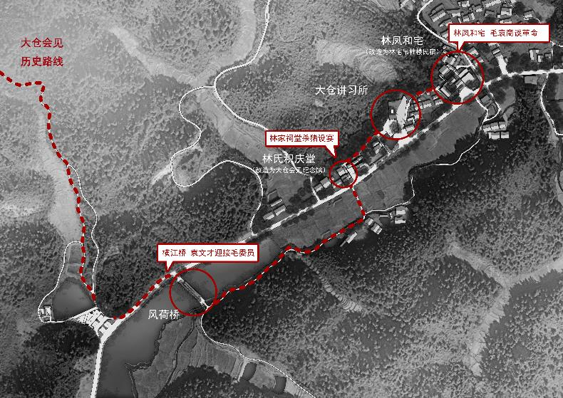 10月6日,毛泽东和袁文才在大仓村进行了一次不同寻常的会面,即大仓会见。大仓位于宁冈古城和茅坪的中间位置,距两地各15华里,四面环山,易守难攻。选此地会面,既表现袁文才出门迎接之礼,也便于暗下伏兵以防不备。毛泽东深知袁文才的顾虑,只七人一马来到大仓。袁文才见毛泽东从容坚定,一片赤诚,遂撤去伏兵,在村口横江古桥亲自迎接。毛袁二人见面双手紧握,相互问好。村民在林氏积庆堂杀猪设宴,欢迎毛泽东的到来。在祠堂简短会面之后,袁文才引毛泽东至林凤和家大院进行了深谈。毛泽东当即向袁文才赠送100条枪,使农民部队能够全员武装。当时军阀混战,枪即生命,这一举动充分获得了袁文才的信任,为农民武装的改造工作奠定了基础。大仓会见的第二天,毛泽东带领工农革命军在茅坪顺利安家,创建了第一个农村革命根据地,点燃燎原的星星之火。
