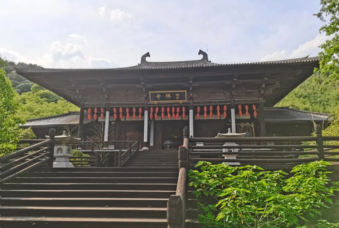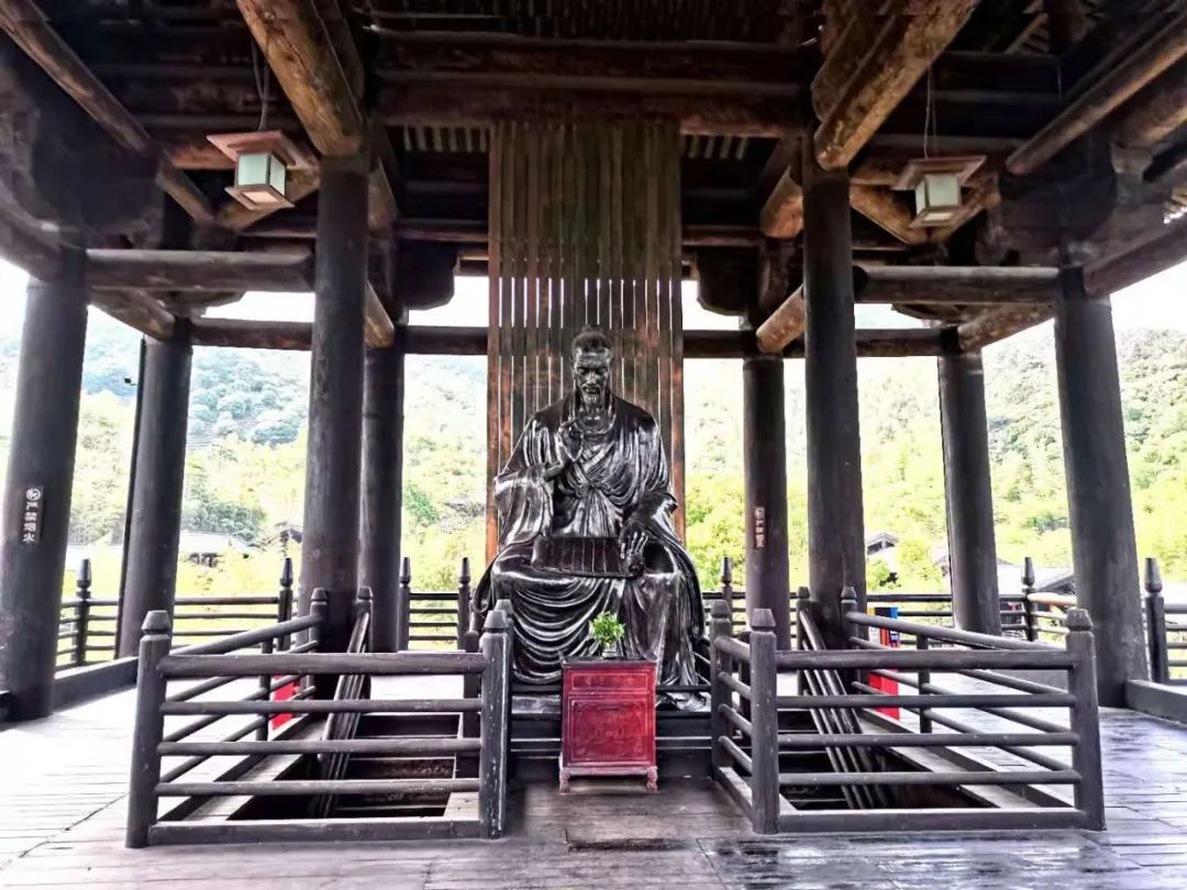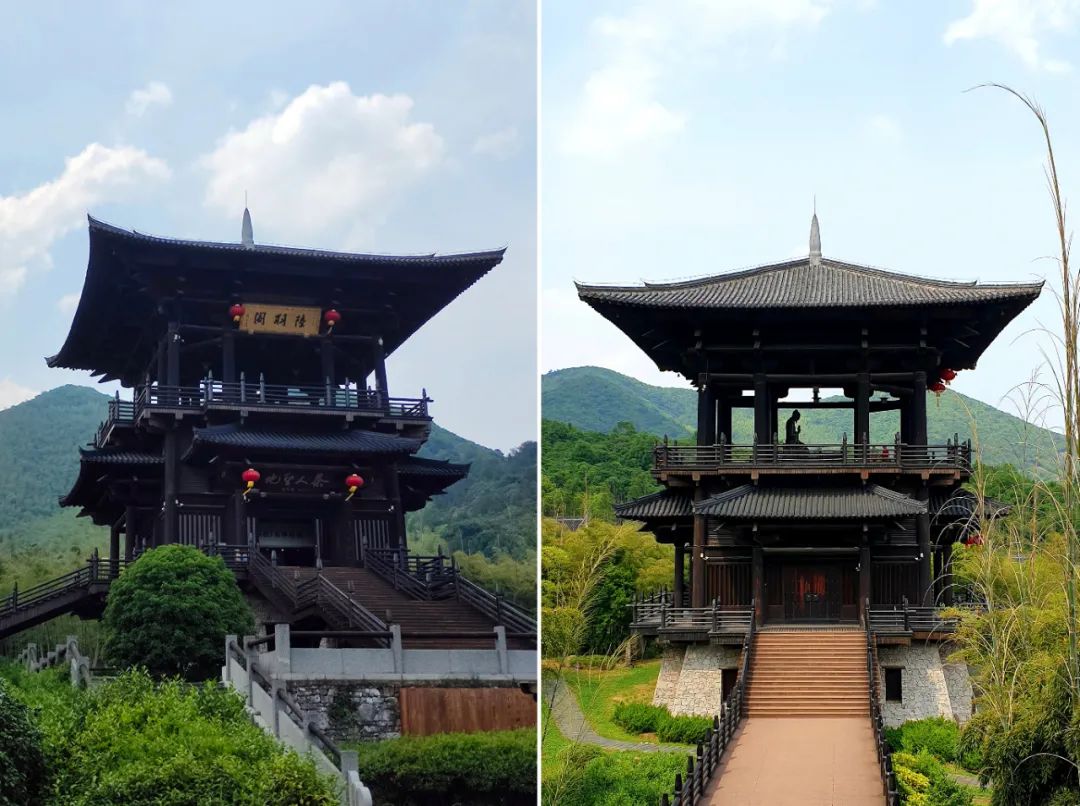 陆羽阁为纪念茶圣陆羽而建,着重介绍《茶经》和陆羽生平。阁高三层,正方形平面,面阔和进深均为三开间。二层明间较宽,装木板门,左右次间稍窄,装直棂窗,符合唐代习制。三层为开敞式布局,空间通透,陆羽雕像居中而坐,享四时之美景,沐八面之来风。底层为台墩式石砌外墙,二层、三层为木构架楼阁,均设悬挑式回廊。沿宽阔的木台阶可由月台直达二楼。屋顶为单檐方攒尖小青瓦屋顶,居中设宝顶,引四条垂脊至檐角。出檐深度达3.3米,相当于面阔尺寸的四分之一(陆羽阁面阔为12.6米),檐角起翘平缓,没有采用江南建筑之水戗发戗、翘角高扬的形式,使陆羽阁轻盈而不失稳重,舒展而不事张扬,尽显大唐建筑简约稳健之风。陆羽阁体量不大,楼阁每层约170平方米,高度至宝顶尖也不过30米,却是贡茶院最引人注目的建筑,何也?郑先生以多种设计手法,突出陆羽阁的地位。首先,他把陆羽阁布置于场区的纵轴与横轴之交点处,其它所有建筑均环伺周围,形成众星拱月之势。其二,所有建筑都是横向体量,惟独陆羽阁为竖向体量,出乎类而拔乎萃,遂有鹤立之感。其三、独特的方攒尖屋顶与周边诸多悬山屋顶形成对比。其四,陆羽阁唐风浓郁,造型优美,轮廓丰富,比例均衡,给人以视觉上的冲击。其五,在陆羽阁前面,设置了一道形式上的"仪门”,门两侧设计了造型优雅的唐风小筑,悬山深檐、直棂窗牗,以这组精湛的建筑小品烘托陆羽阁,更加强调其轴线关系。其六,合理规划观赏路线,从入口开始,院内所有建筑包括东、西廊道,都能从不同角度无障碍的欣赏陆羽阁的洒爽英姿。站在陆羽阁上凭栏北望,一座雄浑的唐朝风格的大殿进入视野,这就是供奉文殊菩萨的吉祥寺佛殿。贡茶院里为什么会有庙宇?唐贞元十六年(公元800年)湖州刺史李词在贡茶院内建吉祥寺,引寺僧参与贡茶院管理。45年后(唐.会昌五年)唐武宗灭佛,寺庙被毁。后来宋元明清各朝屡建屡废,此次与大唐贡茶院一起恢复,重新体现"禅茶一味"。佛殿静静的踞于后院山林之中,不与贡茶院争锋。曲径通幽处,禅房花木深,没有晨钟暮鼓,也没有香烟缭绕,空灵明澈,一尘不染,如得禅茶真味。