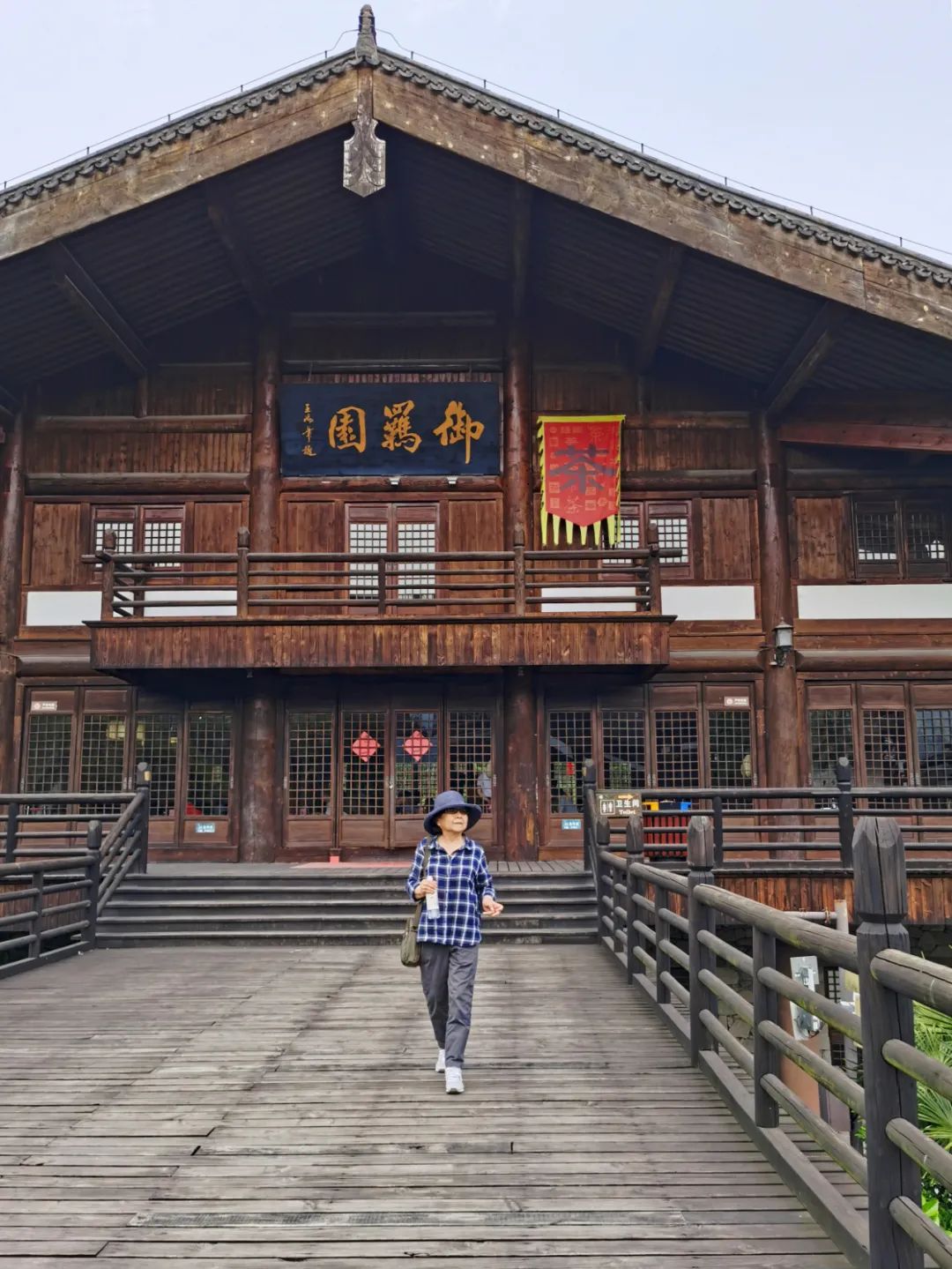 东园与西楼,功能是餐饮、会展、文化活动中心。都采用出檐深远的悬山十字脊屋顶,使面向广场的方向具有高耸而开阔的人字形立面,造型简约大气,突出建筑的入口,体现用于公共活动的厅堂建筑的性质。底层也是台墩式石墙,二、三层依然是木构架结构,二层环以宽敞的回廊,回廊向北与院区的东、西廊相衔,正面与广场木栈道相接,可由广场直接步入二层的大厅。是日,御羁园内正举办长三角围棋邀请赛,众棋手正襟危坐,手捧香茗,静心凝思,举棋落子。在大唐古风的厅堂里对弈,氛围、情调非同寻常。陆羽阁耸立在广场北侧之正中。没有雕梁画栋,没有翘角飞檐,即