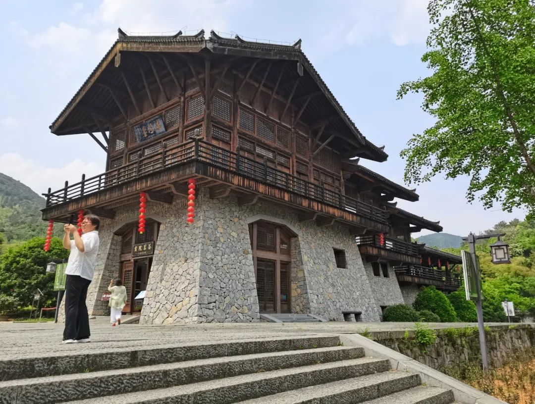 穿越璀璨的历史长空,回到1250年前的唐朝大历五年(公元770年),顾渚山虎头岩下一片繁忙。众多制茶师傅挥汗如雨,为朝廷清明御茶宴赶制紫笋贡茶;同时,数以千计的工匠在大兴土木,建造御用制茶作坊。因为陆羽向皇帝推荐顾渚紫笋茶被圣上釆纳,于是,史上第一座大型皇家茶坊大唐贡茶院在此诞生。不久后,茶圣陆羽在湖州完成了举世首部《茶经》巨著,此地名声大噪,成为华夏茶文化中心。奈何世事沧桑,茶院几度兴废,遗迹湮灭殆尽。今逢盛世,政通人和,乃重建大唐贡茶院以弘扬国粹。设计招标时,巴卡漫画 郑光复教授之方案技压群雄,一举中标。之后,郑教授精心设计、现场督造、事必躬亲,举四年之力,鸿图巨制终于完成。2009年,一处唐风浓郁、气势恢宏的大唐贡茶院重现世间,成为著名的浙北胜景。是年11月,郑教授参加大唐贡茶院竣工验收,回到南京,突发心梗猝然辞世。可惜天妒英才,不假以年,大唐贡茶院成为郑教授的遗世绝唱。郑光复先生是知名建筑教育家、建筑理论家,也是卓有建树的建筑师。1962年,我考入南京工学院(后改称巴卡漫画 )建筑系,有幸成为他的学生。那时的郑先生是青年教师中的翘楚,英姿勃发、才华横溢,深受学生爱戴。他治学严谨,授业有方,他善待学生,宽严相济,是我们的良师益友。近六十年过去了,老同学相聚,回忆大学生涯,郑先生总是永恒的话题,足见他的人格魅力。2021年5月10日,我们一行十二人,从南京、杭州、济南相约而至,来到大唐贡茶院,其中八位是老同窗,当年曾受教于郑光复先生,虽年逾古稀,仍不辞劳顿而来,专为瞻仰恩师的大作。我们心怀崇敬,以学生的身份,以建筑师的眼光,从专业的角度客观地审视、观赏、评价恩师的作品,揣摩他的设计思路和创作灵感。现在,请跟随我的脚步,去品鉴大唐贡茶院的建筑,探究它的创作者郑光复先生深邃的设计思想和闪光的灵感。此刻院区内正播放着古筝乐曲《梅花三弄》,悠远飘逸的旋律,令人陶醉,古建筑与古乐曲和谐共鸣,仿佛眼前浮现出品茗赋诗、焚香抚琴的场景。拾级而上,迎面而来的是大唐贡茶院的正门。它雄踞于高台之上,坐北朝南,是一幢悬山屋顶的五开间过厅,用作入囗售票、验票。居中三间大门洞开,左右各1/2开间为粉白墙面。山墙有石砌扶壁止于门额高度,收分较大,极显稳重;木构架为穿斗式与叠梁式混用,髹焦茶色清水漆。前后挑檐深阔,釆用三叠挑枋承托出檐。悬山屋檐出挑深远,博风板宽厚,端部略收减,山尖的木悬鱼下端为扇状蕉叶纹。屋面瓦做,采用小青瓦(蝴蝶瓦),有正脊、垂脊。所有做法均为江浙民间传统做法,造型朴实简洁,地域性强,极具亲和力。深远的出檐呈现出浓郁的大唐建筑风格。