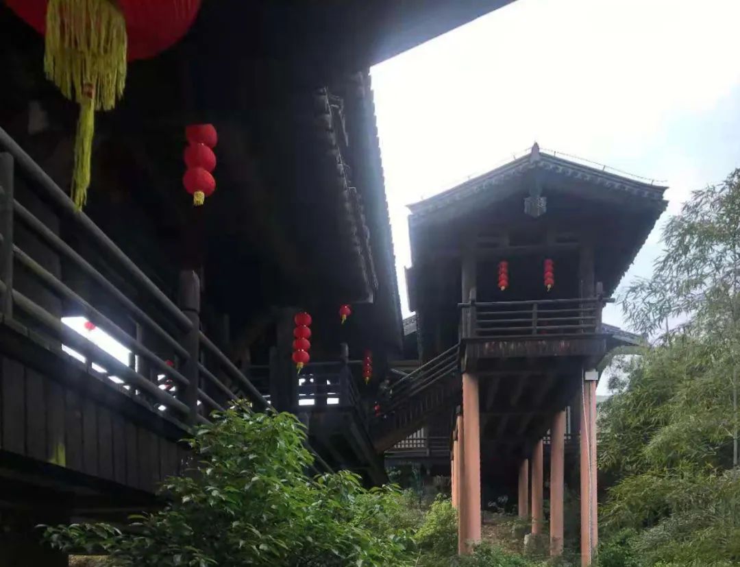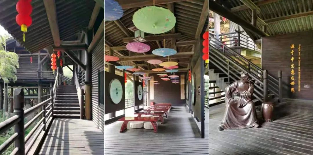 国内唐代木构建筑遗存只有四处,均为宗教殿堂,而且都在山西。对唐代建筑的研究,也仅限于此。在我看来,吉祥寺大殿的造型,基本参照山西五台佛光寺大殿(建于唐大中十一年,即公元857年),既形似又神似,中规中矩,古色古香,体现了唐代庙宇的恢宏气势。吉祥寺大殿建为两层,底层用于展示贡茶院兴衰史,采用石砌台礅式外墙,构图上形成大殿的基座。二层为文殊殿,面阔五间,居中三间,设木板殿门,两边梢间,做直棂窗牗;大殿进深三间,其中一间为前廊;二层殿外有宽阔的月台,架空于地面之上。大殿采用单檐庑殿式屋顶,屋面平缓,挑檐深远,深檐出挑达4.6米,郑先生确实是大手笔,出檐如此深阔,近看似乎夸张,远观却恰如其分。檐下铺作以插拱取代斗拱用于承载檐重。从南面看去,大殿坐落于二层月台之上,庄严肃穆,寂静悠然。我认为郑先生的决策是对的,有范可依就一丝不苟的严格遵循,切忌随意发挥,这就是治学严谨。如“创新”出一个似是而非的吉祥寺,充作唐风古建,只会贻笑大方。我最喜欢、最推崇、最佩服的是郑光复先生设计的大唐贡茶院的东廊和西廊。它们靠近大唐贡茶院的东西边界,是从南到北连接所有建筑物的风雨长廊。郑先生把它设计成空中走廊,游人在苍松翠竹的树梢间穿行,又适度控制走廊高度与各建筑二层回廊相衔接。走廊采用两坡顶小青瓦屋面,出檐较大。干栏式走廊利用圆柱将走廊架空于山体之上,不破坏原始地形和植被,也便于调整廊道的标高。这种创意,受条件约束较少,给设计者提供了较大的发挥余地。看得出,郑先生空中走廊的创意应是来自浙江河姆渡文化的干栏式建筑遗址。我在西廊漫步,东望茶院景致,品味大唐神韵,西眺山外青山,极目楚天风云。清风徐来,树影婆娑,暖阳普照,翠竹斑驳,怎生一个爽字了得!风雨走廊或直或斜,或平或坡,或宽或窄,或曲或折。或重檐相叠,或高低错落。有几处断头相错,露出走廊的横截面,形成廊端的悬山立面。空间变幻多端,却是井然有序,这就是水平,赞叹郑先生高超的空间处理能力。他的奇思妙想,带给游客无穷的乐趣。