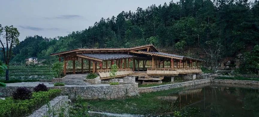 历史叙事的空间编绎是以“大仓会见”为叙事结构重建村庄的公共空间体系,修缮复原历史遗存建筑,并新建公共基础设施。依循当年袁毛会见的历史路径,依次展开风荷廊桥、林氏积庆堂、大仓讲习所、林宅吊柱楼等四个节点,涵盖了传统中国乡村中祠堂、市集、学校等公共设施类型,构成村庄新的公共空间体系。
