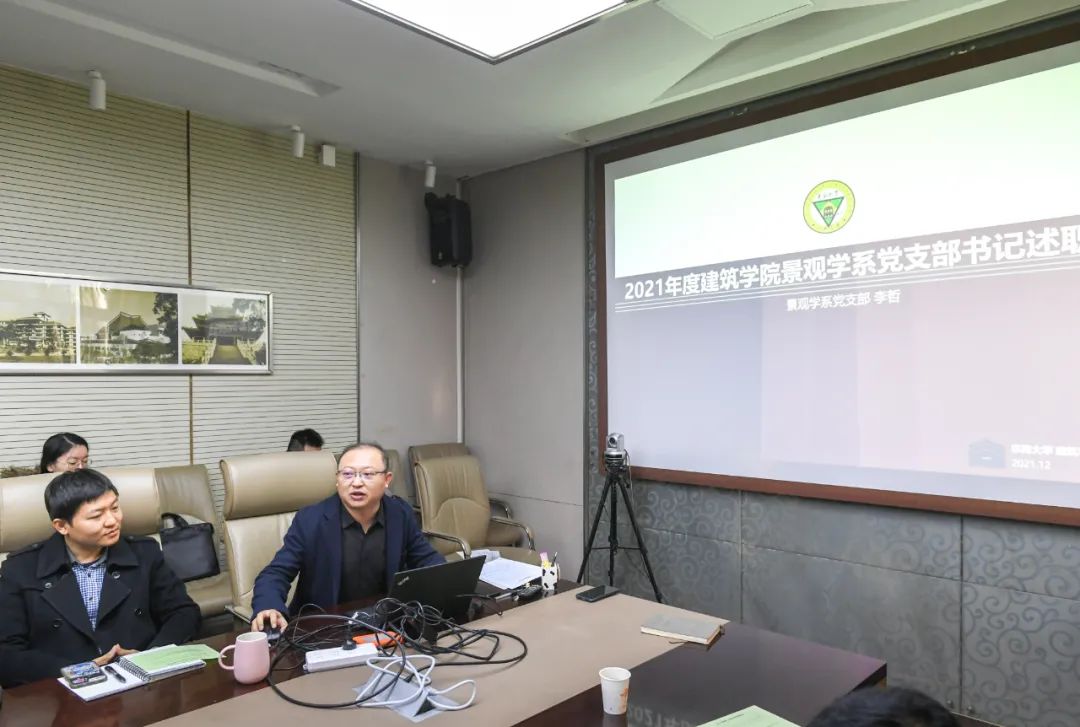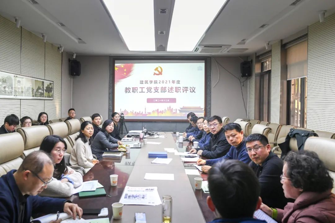 党委书记冷嘉伟首先介绍了学院2021年度党委工作的主要内容,以及本年度教职工党支部书记述职评议的基本要求。接着,建筑系党支部书记徐小东,城市规划系党支部书记周文竹,景观学系党支部书记李哲,教师综合党支部书记李永辉,机关党支部书记贺文琴,建研所党支部书记寿刚,规划院党支部书记宫作成,离退休教职工党支部书记李芳芳依次进行述职汇报,分别从党史学习教育开展、党支部班子建设、党内生活制度、党员教育和管理、党员发展、宣传和思想政治工作、参与学科建设等方面,总结了一年来支部党建工作的特色和具体做法,认真查摆存在的问题和不足,同时进行经验分享和交流探讨。