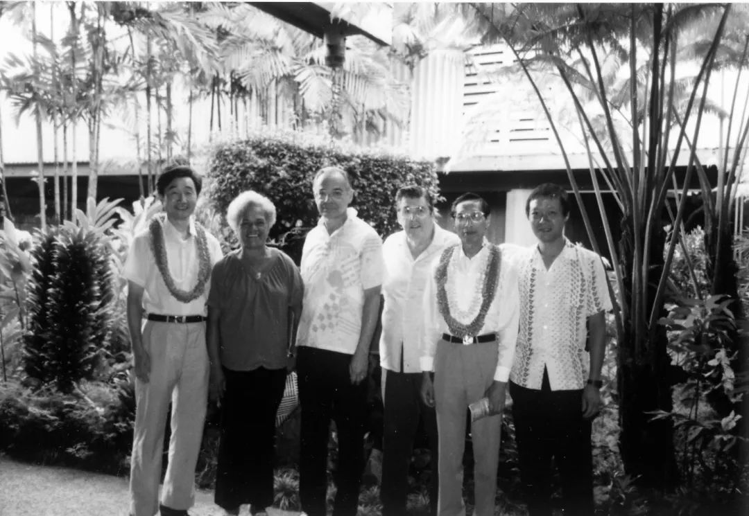 1990年,为夏威夷大学Hilo分校设计“中国园”。图为抵达夏威夷时与前来迎接的McLoad教授在机场合影,右二为沈国尧。