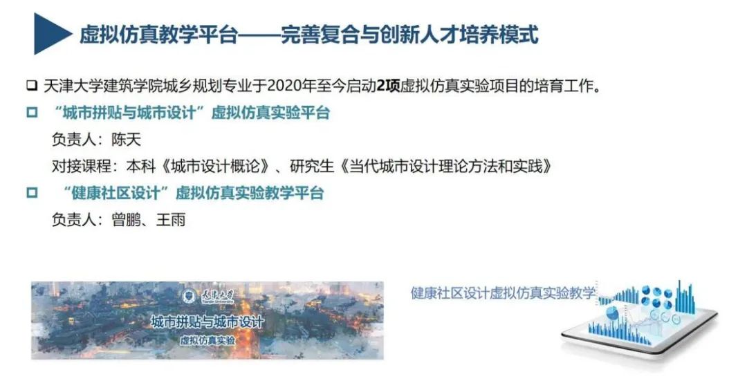 天津大学的陈天教授介绍了天津大学城市规划专业的“城市拼贴与城市设计”和“健康社区设计”两个虚拟仿真实验教学平台,展望了虚拟仿真实验教学改革和产学研一体化构建的前景,并提出通过学校现有的摄影影像技术平台构建数字化城市设计推广平台的设想。