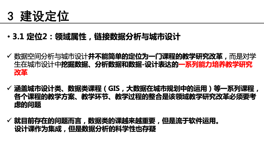 深圳大学辜智慧教授首先介绍了深圳大学的学科方向、教学体系、本科和研究生培养等,重点分享了学校在数理统计与数据分析、地理信息系统的相关教学内容。王浩锋教授在此基础上探讨了深圳大学通过短期的专题形式开展的基于数据分析的城市设计教学案例。