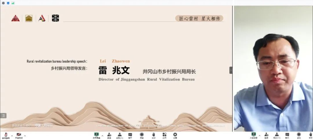 井冈山乡村振兴局雷兆文局长通过网络进行了致辞。他首先感谢并欢迎工作营的全体师生前往井冈山革命老区为15个乡村振兴示范村的规划贡献力量。他指出井冈山是中国革命的红色摇篮,在艰苦卓绝的环境下诞生了第一个革命根据地,新时代的井冈山是全国率先脱贫的样板地区,又肩负着示范乡村振兴新路径的使命。希望通过本次工作营激活乡村发展动力,在乡村振兴的道路上开创并树立井冈山示范样板,使跨越时空的井冈山精神发出新的光芒。