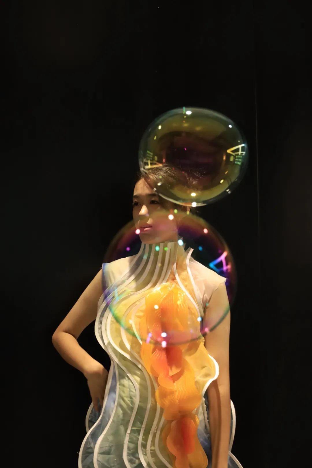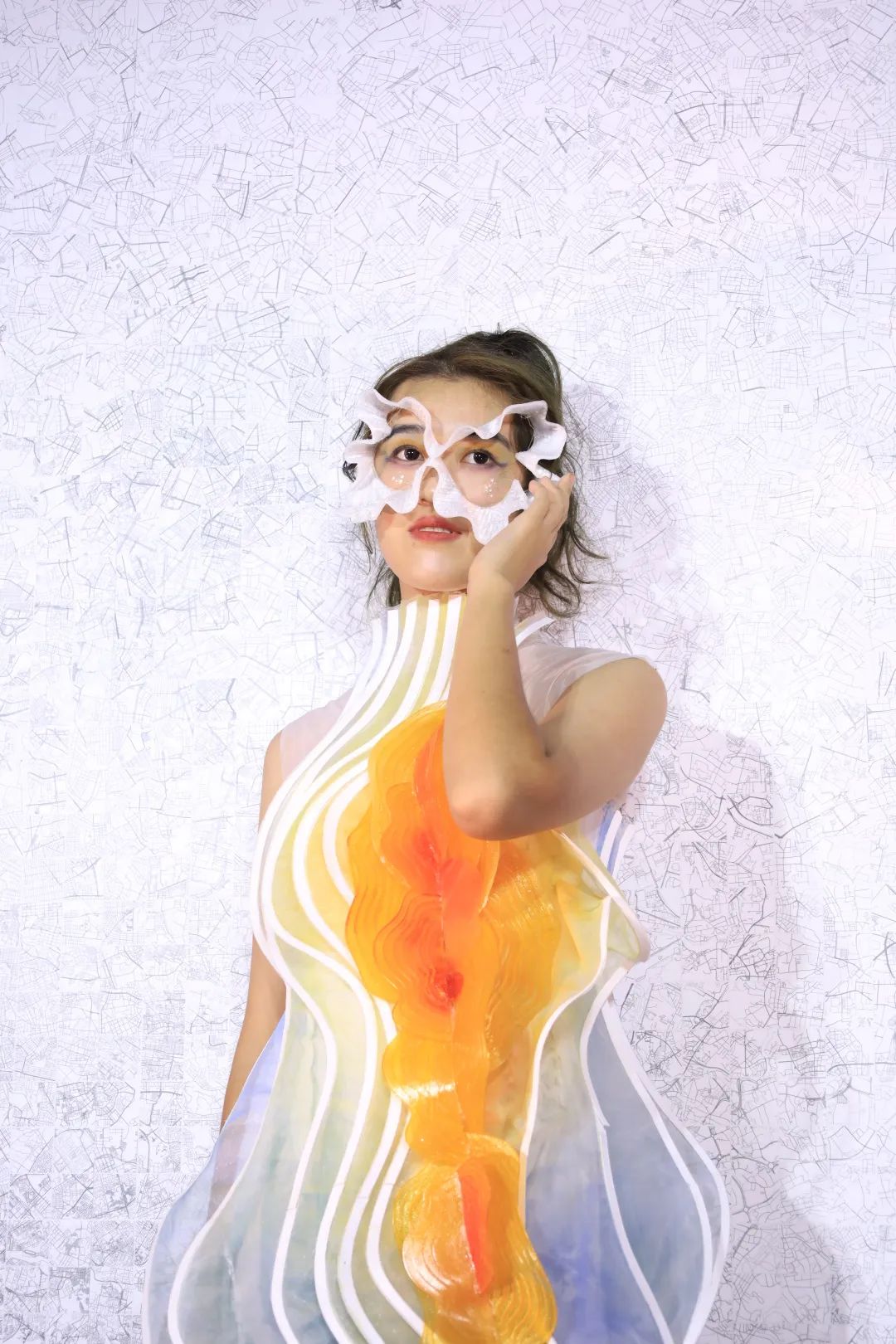 本次工作营以3D打印服装为主要媒介,重点研究定制化的3D打印工艺,令织物与多种材料有效结合形成自成型等复杂机制,对3D打印织物的质感、性能、外观进行数字化调节,由定制化的工艺出发进行服装设计创新。工作营五人一组进行了为期四周的创作,最终诞生了如下五件主题丰富多样的服装。