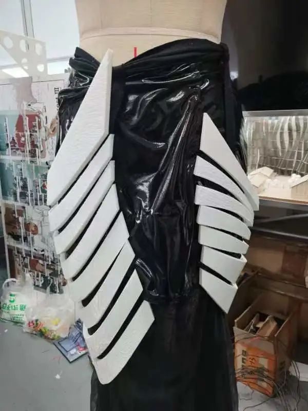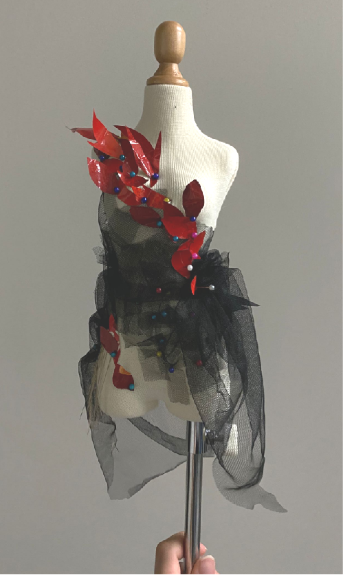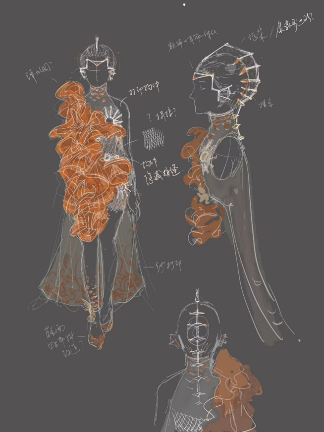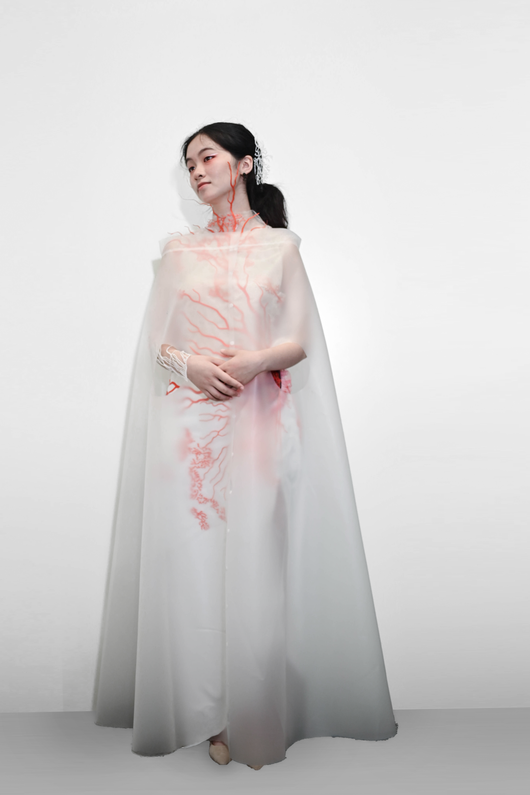 通过立体剪裁,五片板片形成版型,侧片用于版型收缩。将血管纹路打印于其上,透明纱片与非透明布料缠绕结合,达到突出血管纹路同时包庇身体。