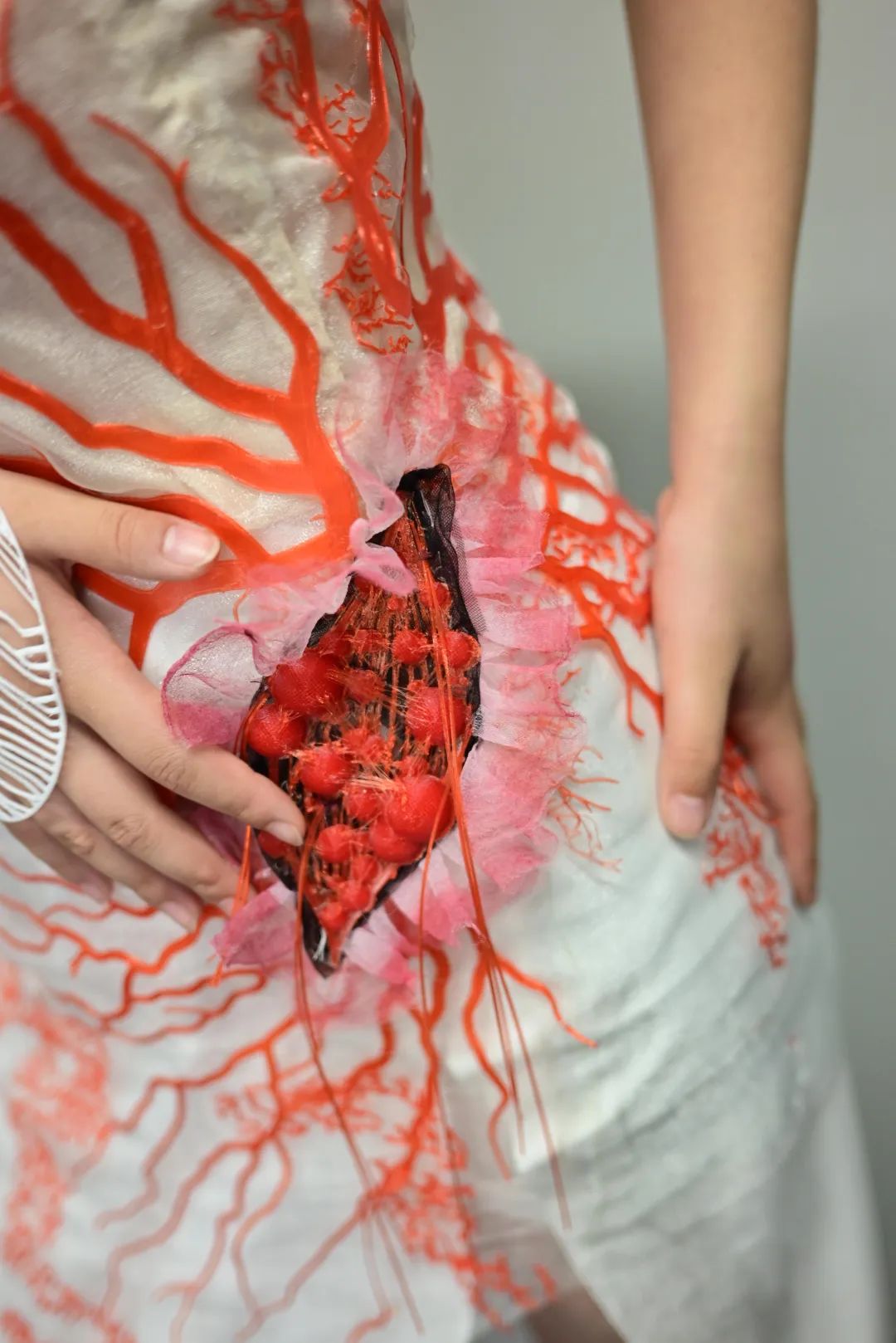 服装或许是最贴近人体的设计。通过服装,我们希望能展示身体的力量。借助参数化的手段,我们模拟人的伤口与痕迹,血管从腰间的伤口处蔓延至全身。最终通过白色的外罩遮盖。最外层的遮盖隐藏了内在,而展示时将脱去外罩,从而展现生命的纹理。