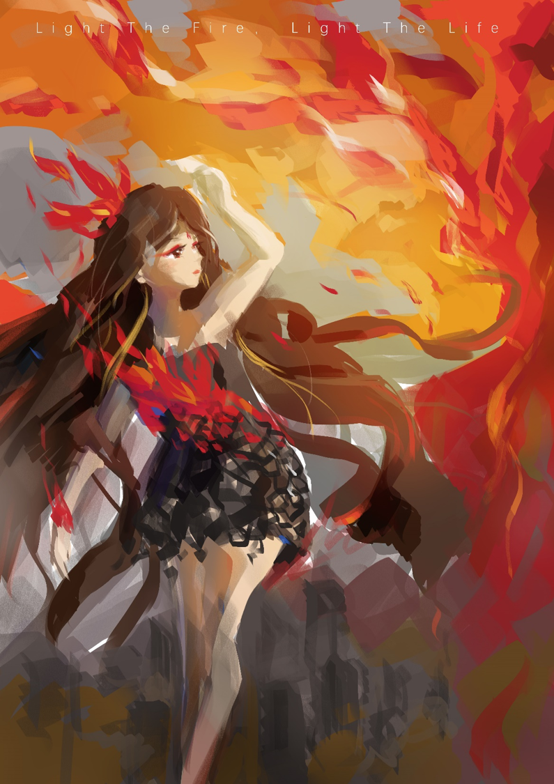 红色的火焰随着人体向上的态势逐渐上升,黑色的灰烬随着裙摆的下垂逐渐下沉,但是灰烬之下诞生了白色的细丝,这象征着废土之中诞生的新的生命。人类的每一次技术革命都少不了火的身影,每一次燃烧都有新的事物会诞生。