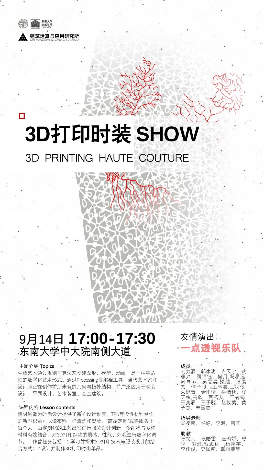 中秋佳节,巴卡漫画 运算所的师生和本科三年级的同学们完成了为期四周的“艺术与媒介”工作营,创作了3D打印时装,将于9月14日17:00中大院前进行走秀演出(如遇下雨,走秀演出将改在前工院一楼展厅),让我们一起了解3D打印服装并欣赏一下同学们的成果吧。