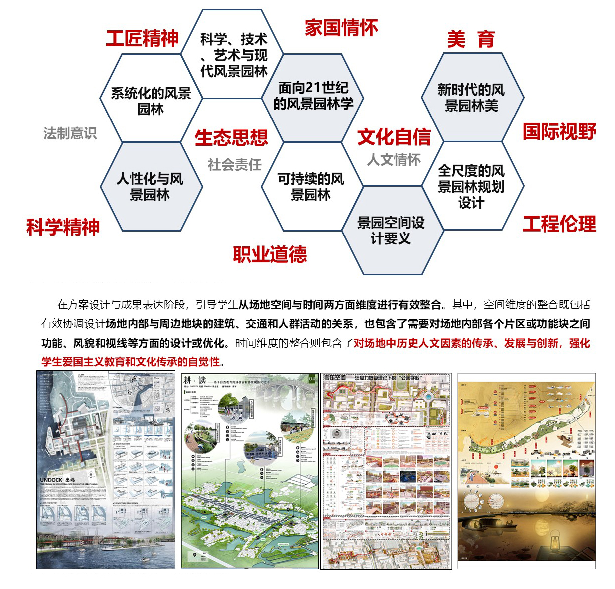 课程以习近平新时代中国特色社会主义思想为指导,铸牢“四个意识”,坚定“四个自信”,坚持具有中国特色的生态文明发展观,秉持科学与艺术相结合、定性与定量相结合的景园设计方法论,建立针对国土与环境、民族与文化特点的景园规划设计技术体系,实现以“耦合法”为代表的景园规划设计教学方法创新,集成融入数字景观理念、方法与技术,基于7项国家发明专利进行“数据信息-空间信息”定位耦合技术、参数化风景园林适宜性分析技术、规划设计综合调控技术的教学应用,实现了风景园林调查分析、规划设计的原创性技术突破,课程内容融入“绿水青山就是金山银山”的两山理论、“山、水、林、田、湖”生命共同体、海绵城市、城市双修、智慧城市、公园城市、健康城市等国家发展战略,全过程应用于风景园林规划设计教学中成效显著、具有技术领先意义。