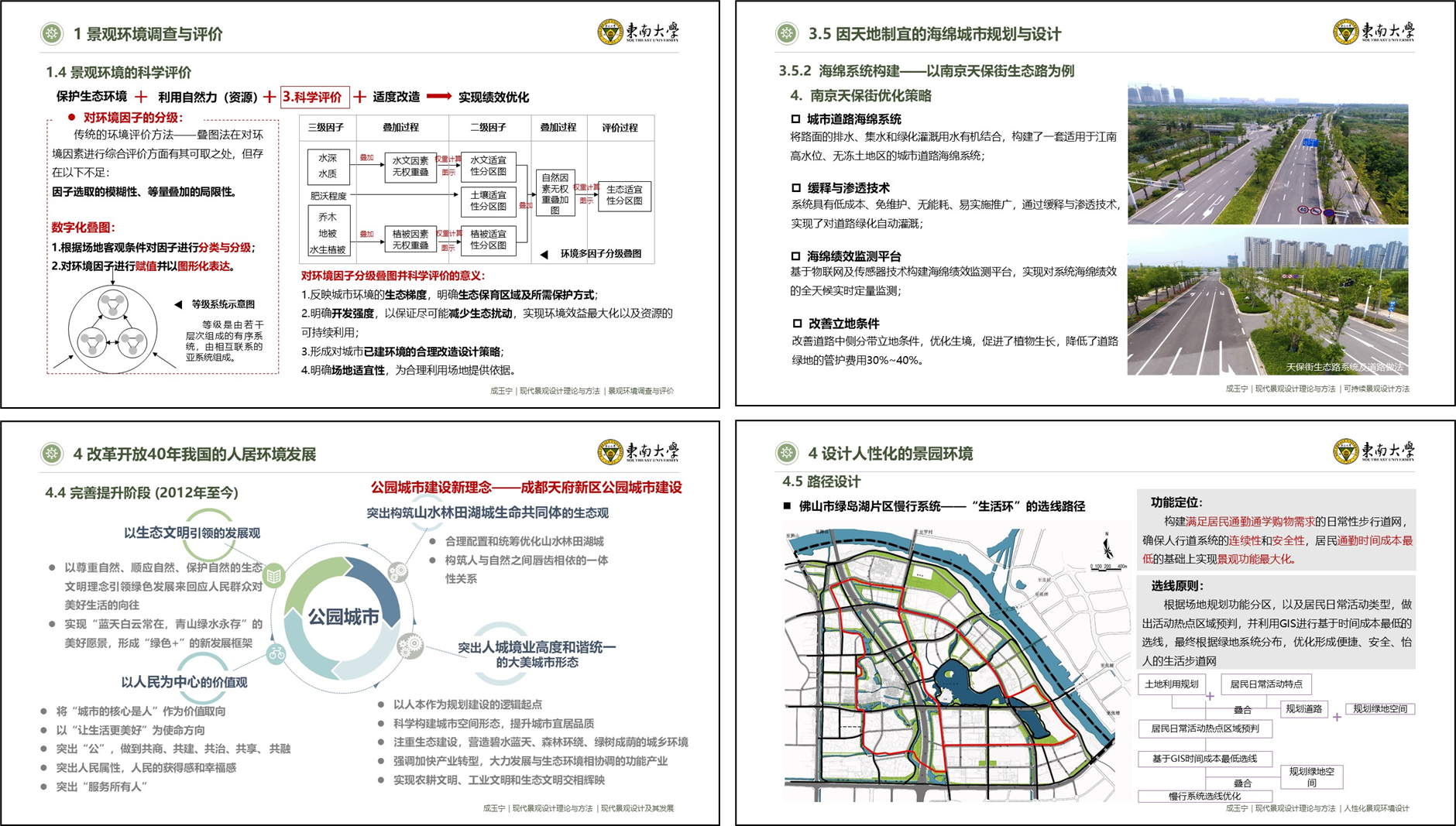 《现代景观设计理论与方法》的课程内容聚焦人居环境科学与高质量发展,以宣传生态文明思想、树立民族自信、传承中华优秀文化为宗旨,以讲授科学可持续的规划设计方法为内容,帮助学生透过百余年景观设计的变迁历程、纷繁复杂的理论与实践,从景观环境本体出发,理性地思考现代景观设计理论内涵,掌握符合规律的景观规划设计方法。本课程响应国家重大战略,针对我国当代人居环境发展面临的问题,紧密结合优秀案例,通过“现代景观设计及其发展”、“景观环境调查与评价”、“可持续景观设计方法”、“人性化景观环境设计”、“现代景观空间建构”、“景观设计思维与表达”六章教学内容,培养学生在“实践中思考”的能力,最终促成“有思想的设计”,加深对人居环境科学与景观设计规律性的认知,提升理论水平与实践能力。