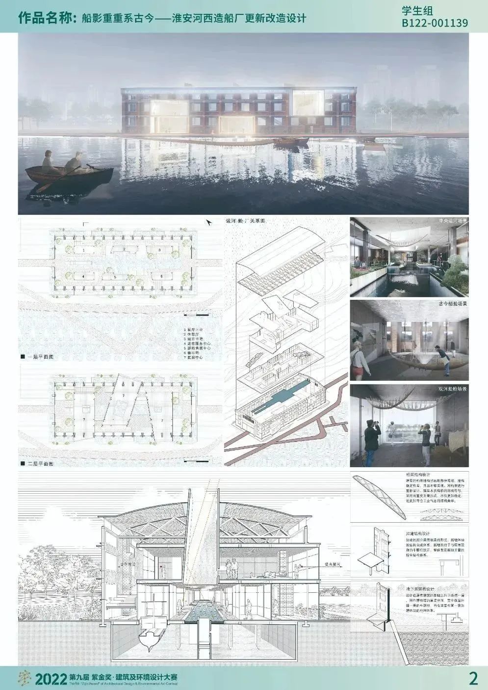 学生组专业评委经过激烈的现场角逐,我院参赛队伍取得2金2铜的优异成绩。其中《船影重重系古今——淮安河西造船厂更新改造设计》、《漂流集市——京杭运河邵伯船闸锚地复合更新计划》获得金奖;《回声·反哺——溧阳市旧红旗水厂更新设计》、《织廊寻河纪——工业厂房改造设计》获得铜奖。