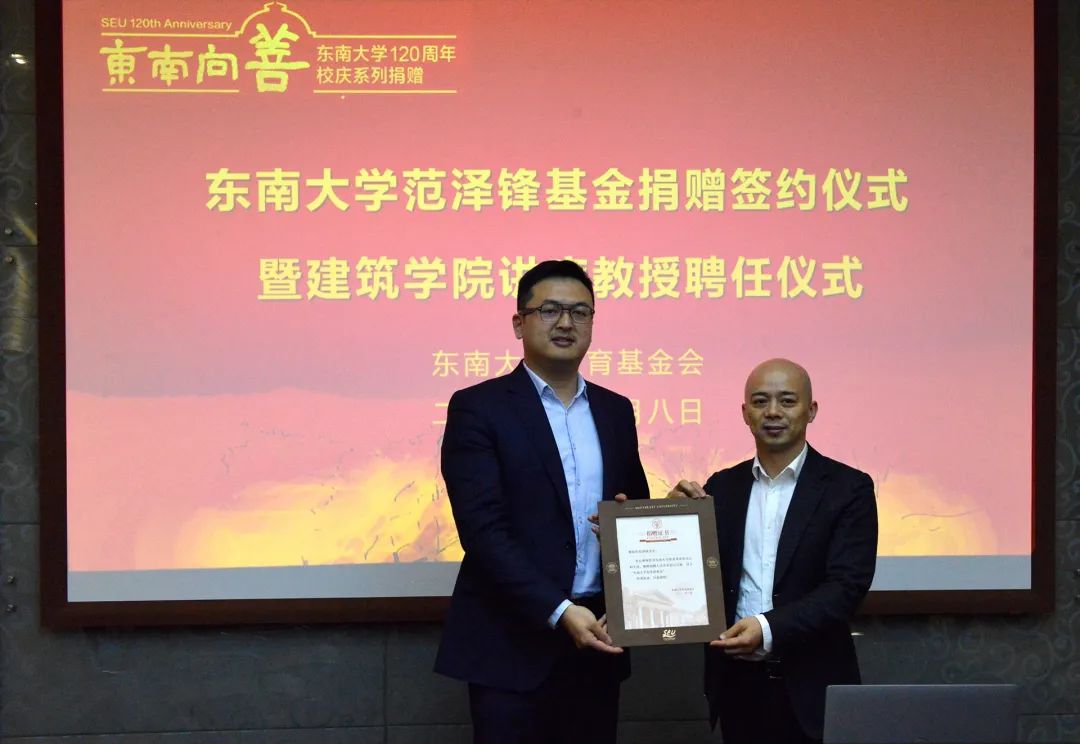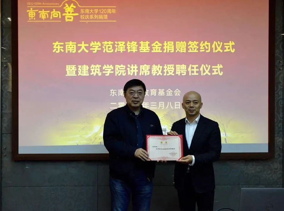 捐赠人范泽锋先生在捐赠仪式上表达了他心系教育的情怀,希望用捐资行动回馈教育,祝愿学校培养出更多建筑学领域的领军人才。捐赠仪式后,冷嘉伟书记向范泽锋先生颁发了巴卡漫画 讲席教授聘书,聘任其担任陶艺教学及实习课程的授课教师。