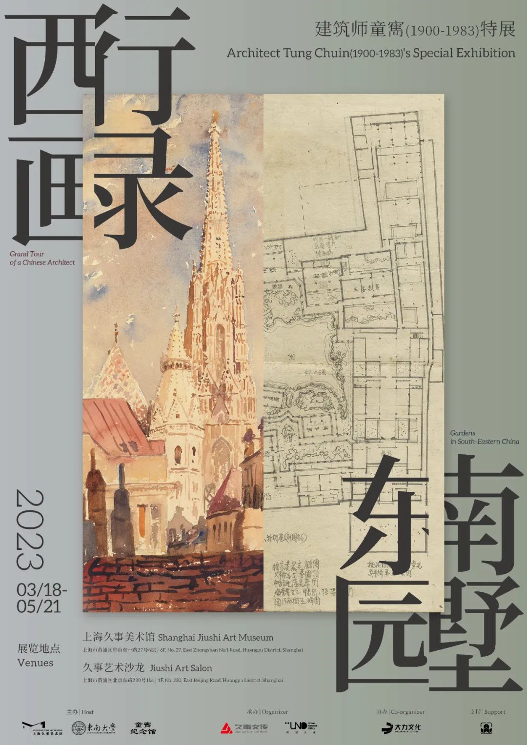 2023年正值童寯(故居)纪念馆即将落成,及《江南园林志》出版60周年之际。本次展览上海久事美术馆将以童寯一生中两次重要的经历为引导,通过《西行画录》《东南园墅》两大主题,在久事美术馆群落旗下的美术馆和艺术沙龙两处场馆联动展出,分别向观众展示童寯壮游欧洲时期的写生画作和其作为职业建筑师时期进行中国园林研究的相关资料,带领观众一同解读童寯与建筑、艺术与园林的秘密。
