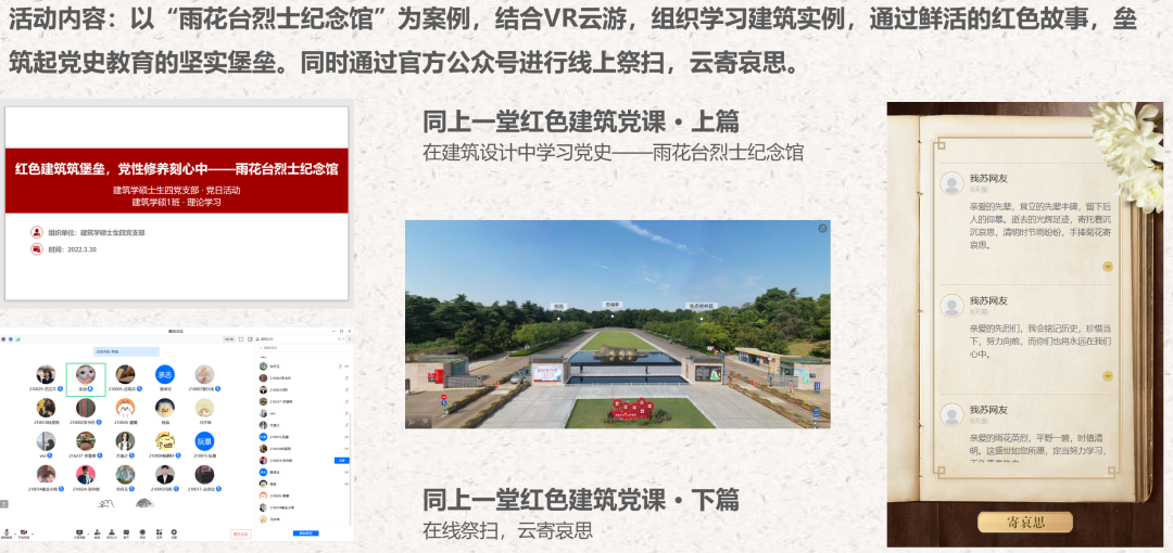 党日活动以“雨花台烈士纪念馆”为案例,结合VR云游,组织学习建筑实例,通过鲜活的红色故事,传承革命精神。