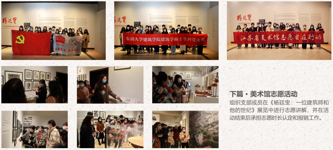第二,上年度组织学习交流较少,本年度支部组织“杨廷宝志愿服务”,通过线上培训、线下服务的方式,在实践中促进支部间交流、支部成员间交流、支部成员与市民群众交流;此外,本年度组织“建筑创作中的党史学习”党日活动,党员带领积极分子、团员,结合专业特色共同学习交流党史。