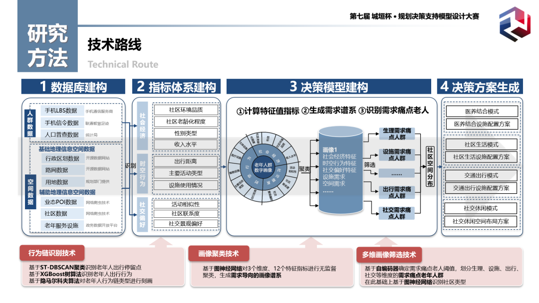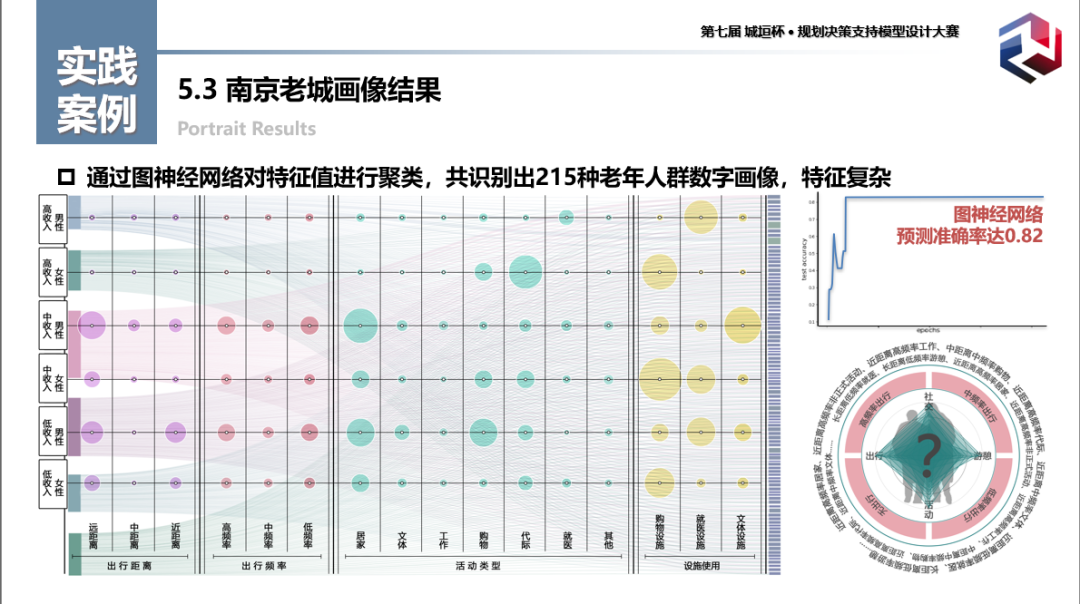 参赛编号:I1261参 赛 人:吴玥玥 戴运来 王暄晴 崔澳 丛万钰 陈旭阳工作单位:巴卡漫画 报名主题:面向高质量发展的城市治理研究议题:城市行为空间与社区生活圈优化技术关键词:人群数字画像、时空行为分析、图神经网络研究摘要:中国人口结构正快速由中度老龄化社会向重度老龄化社会逼近,面临人口老龄化的严峻挑战。随着物联网、大数据、云计算和5G等前沿信息的迅速发展,智慧养老得到了国家和地方政府的高度重视,是全面贯彻落实积极应对人口老龄化国家战略的重要抓手。然而,目前城市空间与设施普遍存在适老化不足和供需失配的问题。坚持以人民为中心的发展理念,实现对老年人多维需求的精准识别,是推进建设健康适老化城市的关键问题。因此,本研究结合LBS、手机信令、POI等多模态数据,利用行为链识别技术、图神经网络画像聚类技术和需求痛点老人筛选技术,建构了一套数字化采集、数字化分析、数字化规划全流程的老年人群多维需求识别与规划决策支持模型。将该模型在南京老城进行实证应用,其老年人总数约为14.9万人,从社会经济、时空行为、社交联系3个维度对老年人群进行数字画像刻画,共识别出215种画像,图神经网络聚类准确率达0.82。从生理、设施、出行、社交方面筛选出“足不出户”“设施缺位”“超级出行”“社交孤岛”4类需求痛点老人,在此基础上识别上述南京老城需求痛点老人的社区分布情况,并针对性提出规划策略。