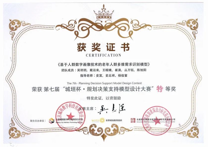 本届大赛由吴志强院士担任主席,国际欧亚科学院院士邬伦教授、武汉大学数字城市研究中心主任詹庆明教授、自然资源部信息中心原主任蒋文彪、中国地理信息产业协会教授级高级工程师汤海等15位来自国内城市量化研究及相关领域的行业权威专家组成终评专家组,对19个终评入围参赛团队开展评选。最终共产生特等奖两名,一等奖五名,二等奖十二名。其中,史宜老师、史北祥老师、杨俊宴老师指导的 《基于人群数字画像技术的老年人群多维需求识别模型》荣获全国特等奖。评委点评该作品“选题聚焦,以人为本,关注个体、弱势群体及群体内的需求和短板,作品方法具有创新性。”