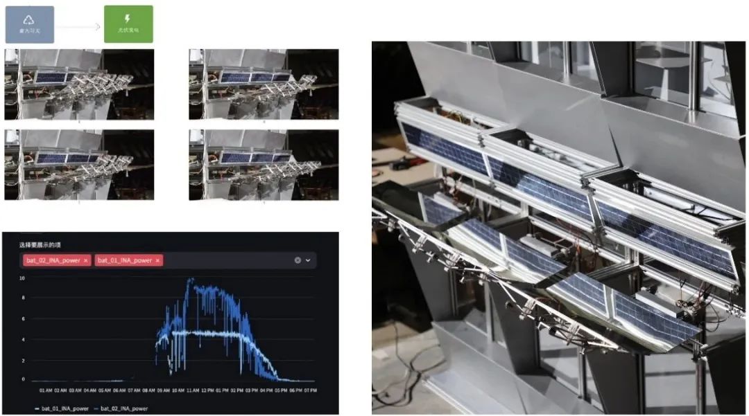 搭建完毕后,课题组在真实环境中进行了测试并采集数据。反射式互动光伏立面峰值能量效率达到最佳角度放置光伏板的两倍以上,全日综合发电量达到最佳角度太阳能板的150%,由于反射效率、发热、电池损耗等一系列原因,实测数据略小于此前模拟数据,但依然达到了比传统固定式更优秀的光伏收集效率。