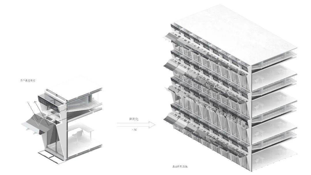 基于此,本设计课题尝试采用互动技术,通过自动控制系统和机械结构设计,课题组设计了一套多模态光伏节能建筑表皮系统,系统由互动立面模块组合而成,实现以下功能:1. 自适应反光系统将原本成为窗口眩光或被反射成为城市光污染的墙面直射光线,集中反射到小幅面的立面太阳能板上,提高单位面积光照强度,提升发电效率,减少光伏板面积。2. 嵌入式反光吊顶在太阳辐射强度较低,用于光伏发电效率不高时,可以将太阳光直接反射 进入建筑内部的导光吊顶内,以帮助提供室内照明并优化建筑内部光环境的均一性。3. 智能化表皮控制系统为实现表皮系统的整体能效表现提升,表皮系统会依据实时的外部环境与内部需求,以综合能效为与功能需求为出发点, 控制对所获取能量的使用分配。