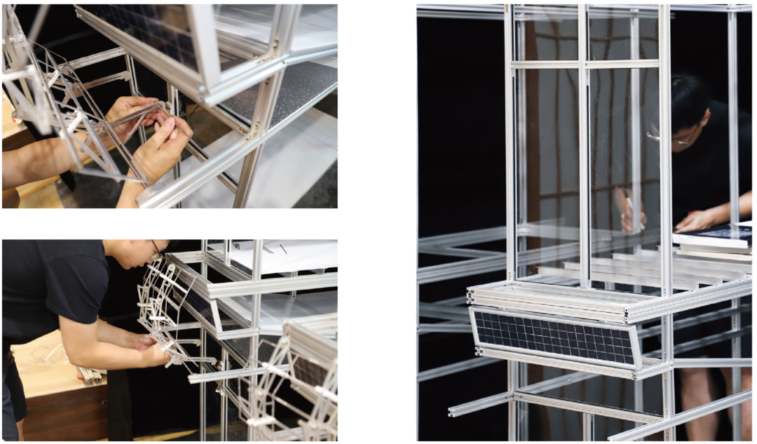 为了验证实际运行效果,学生搭建了1:42*3模型单元阵列,使用3D打印制造定制化节点,使用CNC与激光切割制作其他构件。
