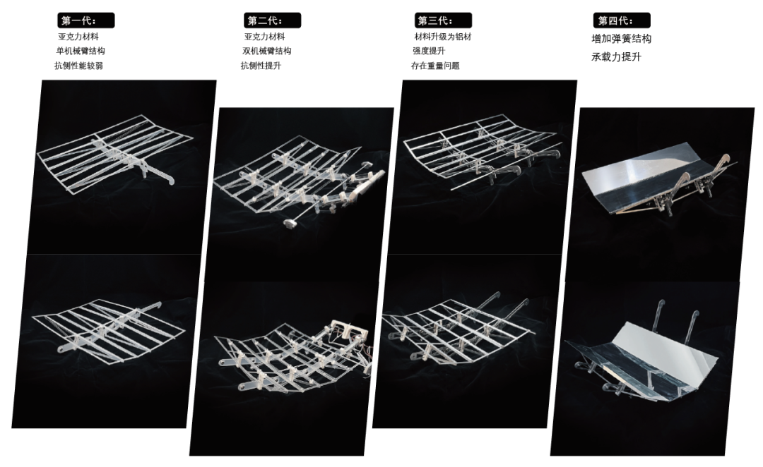 为了计算最优机械结构形态与模拟发电效能,学生使用C#开发了专用的迭代模拟优化软件,解决了传统日照计算软件无法应对的动态反射类型问题,并申请了两项软件著作权。通过对于全年日照模拟,计算了各关节长度与控制角度。每个单元由两组电机分别控制关节的弯折与整体的倾斜角度,通过SolidWorks建模对运动进行验证。课题组对多种反射方案进行模拟分析,经过模拟计算,最终采用手指型反射板方案。其能量效率在不考虑现实损耗的情况下,最高能够达到时刻垂直于太阳光线的等面积太阳能板效率的109%,而较传统固定PV则可提升约189.30%