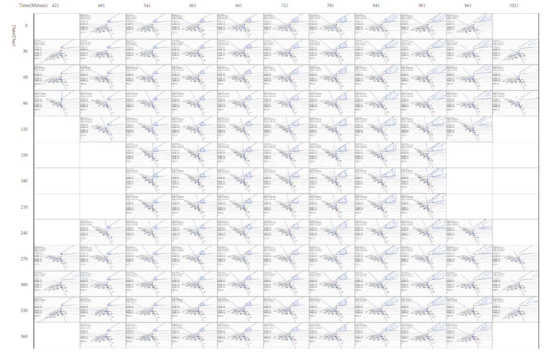 在本项目中,建筑体量方案的推敲与其建筑环境息息相关,在设计过程中需要保证建筑方案设计与建筑环境分析同步进行、相互驱动。在本项目确定使用光伏表皮作为建筑南向立面的设计方向时,不同建筑体量方案所接受到的太阳辐射尤为重要。南向面所接收到的辐射量将很大程度上影响建筑光伏表皮的发电效率与调控目标。因此对于本项目,需要将建筑体量的发展与建筑表面全年日照辐射量协同考虑,用日照分析促进建筑设计方案体量的发展。对本项目使用固定式光伏表皮情况下,一年中典型时刻的室内光照强度进行模拟分析,可见在建筑的 3-5层办公功能空间中,南向房间的光照强度较高,但单个房间内的均一性不足,靠窗位置的光照强度远高于远离窗户处;其他空间中的光照条件较差,表皮系统对建筑内部光照分配的引导作用较低。对于光伏发电量而言,经模拟计算估计,当建筑使用固定式光伏表皮时,全年的发电量约为 19483kWh,发电总量较高,但所使用的光伏板面积较大,其单位面积的发电效率较低。