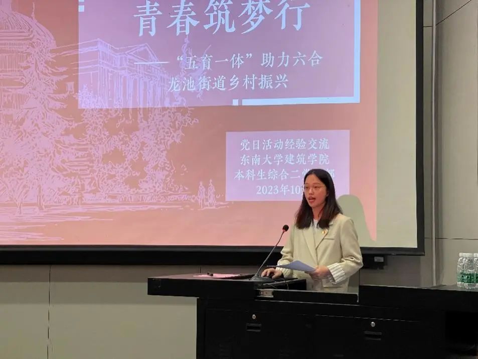 建筑学硕士生五党支部书记许凌子围绕江苏省高校最佳党日活动优胜奖《百廿载仁辉匠心筑梦 双甲子东大匠艺强国》进行经验分享。支部基于杨廷宝诞辰120周年和巴卡漫画 建校120周年设计开展一系列历史梳理、实地调研、志愿服务、经验分享、主题党课、师生座谈、虚拟展厅、摄影绘画、知识竞赛等主题党日活动,以专业促进新时代党员培养,以机制挖掘研究生支部潜力。