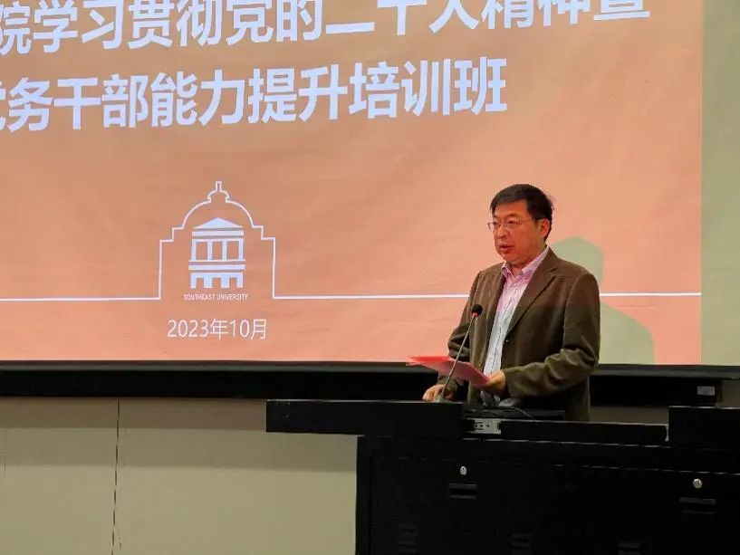 在开班仪式上,党委书记冷嘉伟作开班动员讲话。他指出,党的基层组织是党在社会基层组织中的战斗堡垒,是党的全部工作和战斗力的基础,通过此次培训,各党支部要真正把思想和行动统一到党的二十大精神上来,进一步筑牢基层支部“桥头堡”,引导党员当好“主心骨”,把学习成果转化为推动党建工作的强大动力,为推动学院各项事业高质量发展提供坚强的组织保证。培训班要求,要强化政治担当,着力学深悟透,推动学院党建工作走在前、做表率;要强化使命担当,夯实基层基础,提升党组织的组织力、战斗力;要强化实干担当,服务中心大局,促进党建和业务深度融合;要强化作风建设,树牢党章意识,全面从严治党永远在路上。