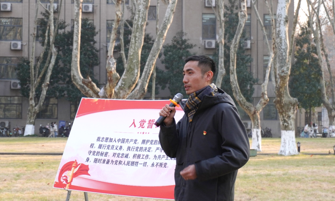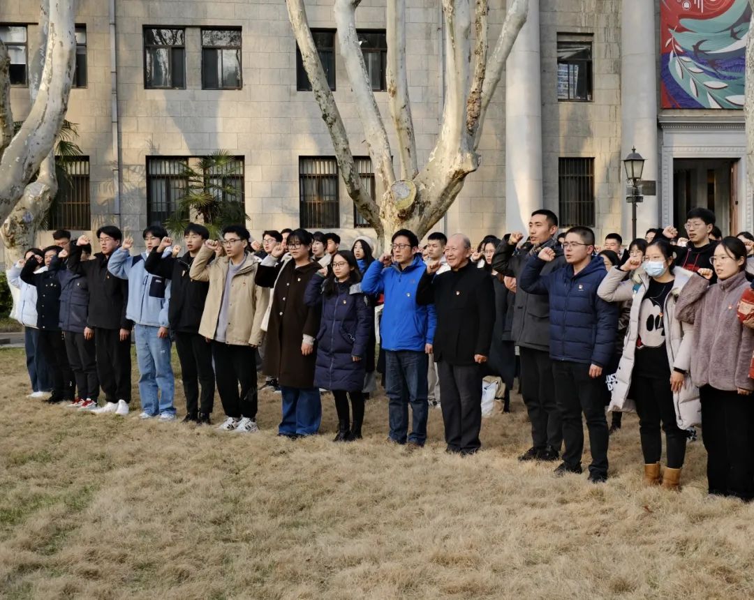 随后,师生一行移步中大院面前的大草坪,并分为五排站队,新发展党员站在队伍的最前列。仲德崑老师、张豪裕老师、曹俊老师、奚月林老师分别为近期19位新发展党员佩戴党徽,这是对新发展党员的肯定和鼓励,勉励他们坚定信念,不忘初心,牢记使命,不断学习和进步,以新姿态从容主动、更加积极地践行党员义务,履行党员责任。