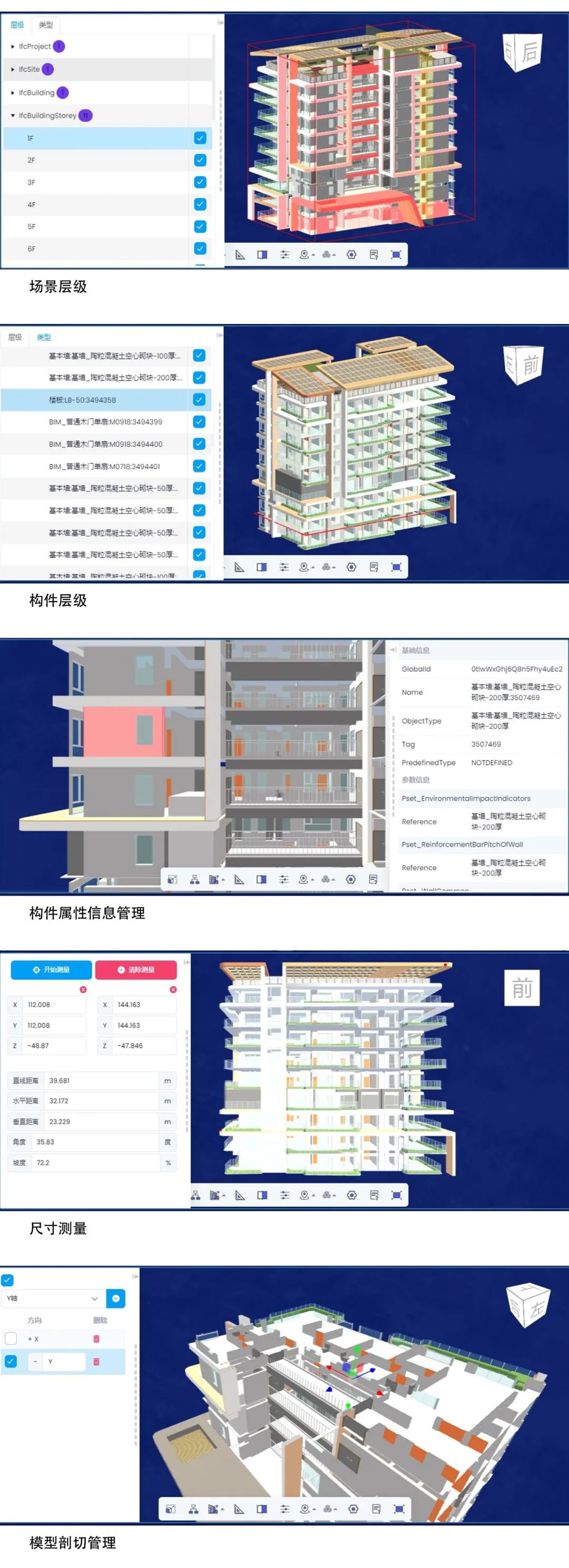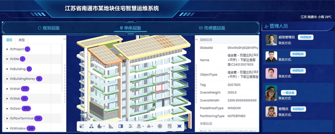 以IFC数据交互格式为基础,利用Html5和WebGL技术,成功实现了BIM模型在平台端的高速渲染,为建筑项目提供了一种轻量级的,同时兼具专业性的内部详细信息呈现方式。该智慧运维平台能够提供场景层级视图、可视化模型渲染、构件层级展示和尺寸测量,还支持模型剖切使得细节观察更为精准,具有可视、可管、可交互、可模拟和可预测的特性。真正实现了项目设计-建造-运维的BIM全过程工作流程,有力地促进了项目各个阶段的协同合作和数据流通,提高了建筑项目的效率和质量,为行业带来了技术和管理进步。该技术的前期研发工作受到“十三五”国家重点研发计划课题“村镇运维信息动态监测与管理关键技术研究”(2020YFD1100405)的资助。