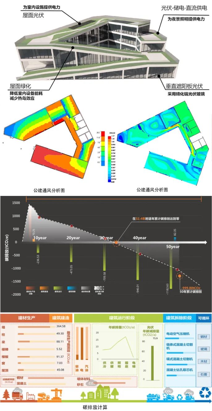 本作品灵活利用场地中现有的水系,秉持着“数字营造,绿色共享”的设计理念,对公建和住宅进行有机组合,在绿色低碳、建筑信息模型、装配式建造等方面开展针对性设计。作品运用仿真模拟等技术手段对设计方案进行优化,利用团队自研的WebGL三维轻量化技术打通BIM设计、施工和运维过程,将一模到底技术得以有效利用。此外借助具有自主知识产权的碳排放在线计算平台,对建筑全生命周期碳排放进行估算,并给出碳中和实现周期,由此实现了建筑信息化与建筑创作之间的深度融合。