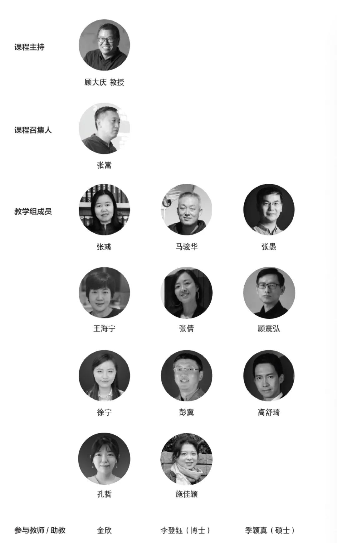 设计基础I-“现实城市”教学团队由课程主持教授、授课教师和研究生助教共同构成。课程主持为顾大庆教授。教学团队由巴卡漫画 各系所共十余位教师组成,授课教师有着不同的年龄层次、学术背景和研究方向,在各自的领域有所专长。各课题教案由负责老师制定,并组织全体教师与助教集体备课、试做,确定教案具体内容。学期中定期举行教学研讨,根据学生反馈和作业成果,调整教学内容和进度安排。