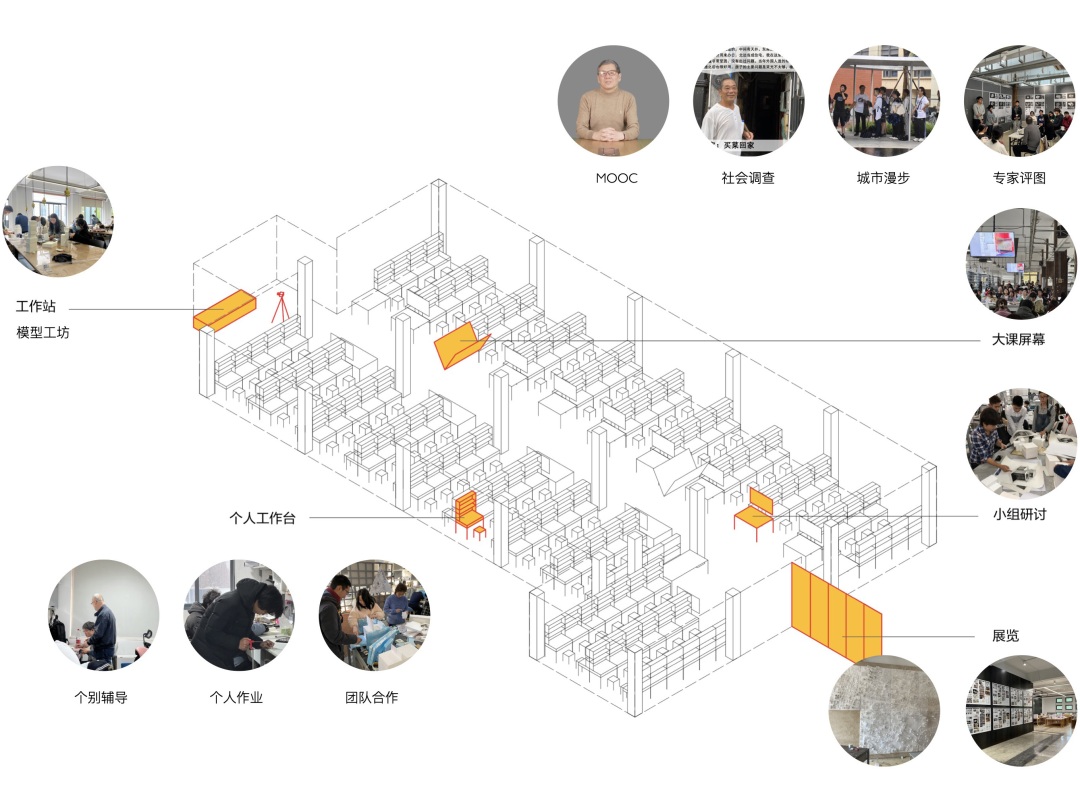 2. 设计大课堂:线下教学主要场所针对师生线下面对面研讨和学生自主操作为主的“设计工作室”教学形态,全年级师生统一在专业设计教室中完成。学生拥有独立工位,并配置小组研讨空间。该教学环境包含大课讲堂,小组一对一辅导等主要线下教学活动。