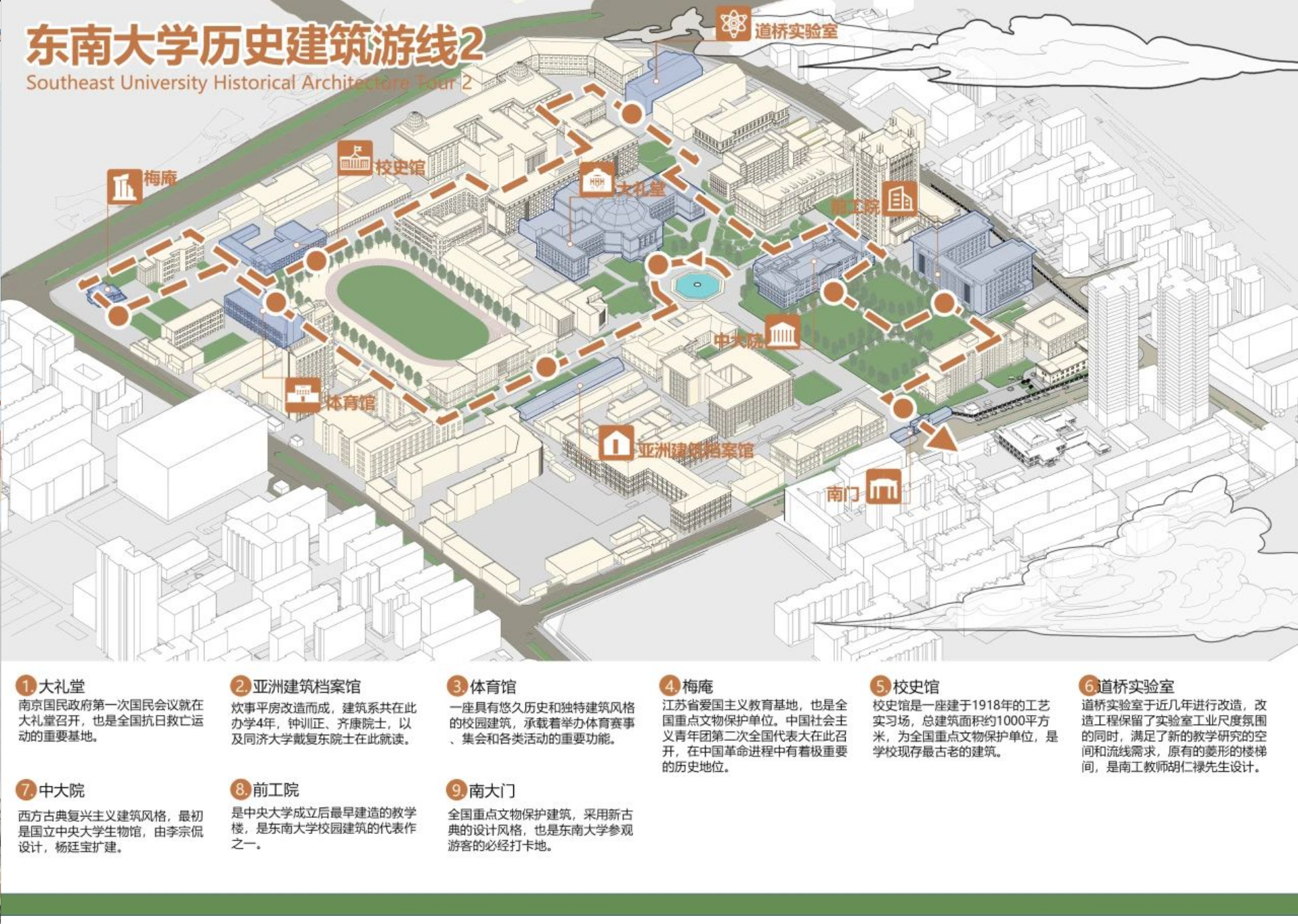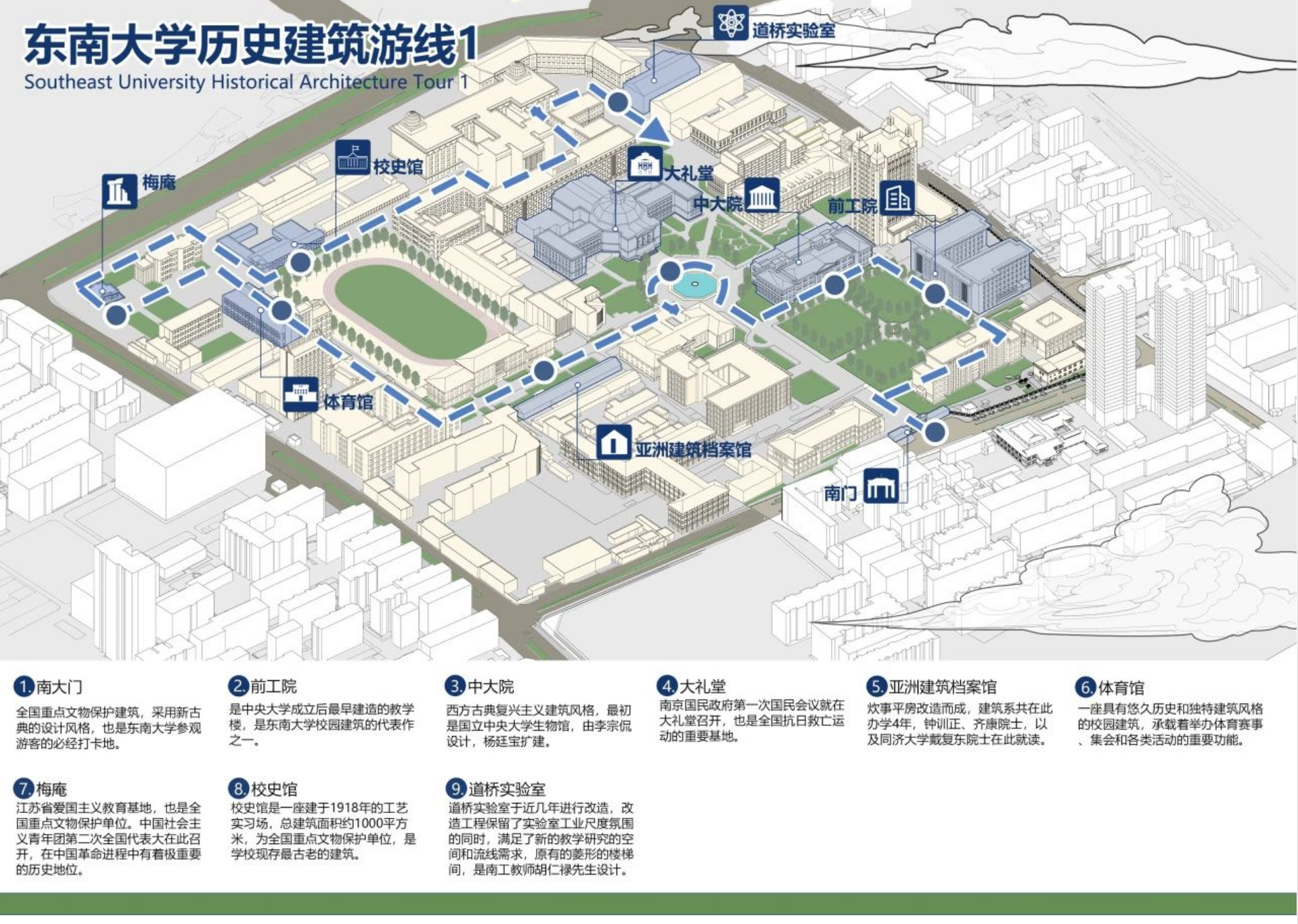 南大门-前工院-中大院-大礼堂-亚洲建筑档案馆-体育馆-梅庵-校史馆-道桥实验室