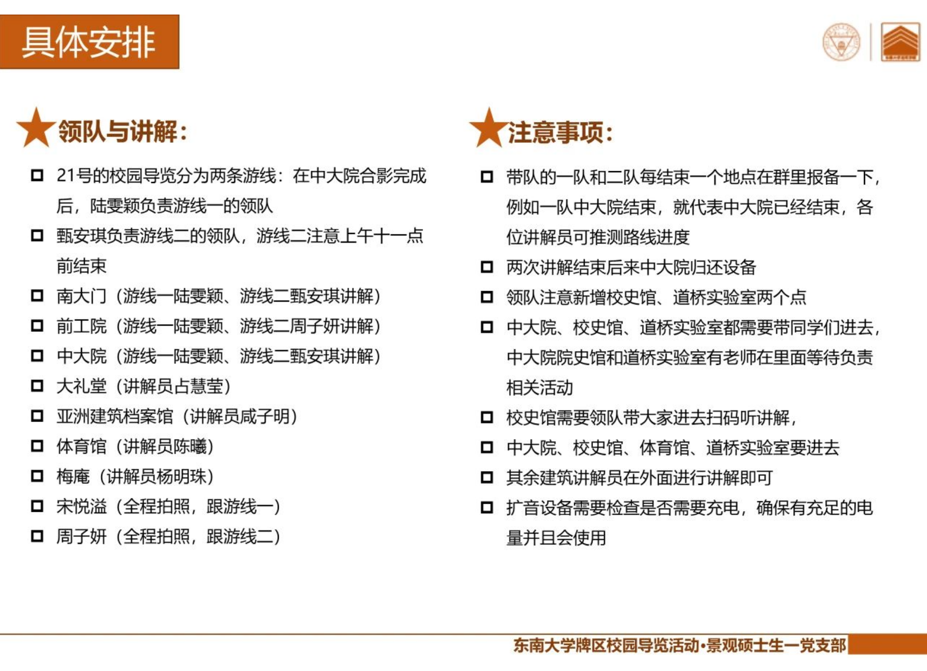 由于本次导览活动新添加了几个讲解点,并对来访师生分两队带队讲解,支部为做好充分准备,提前参与了之前的校园导览活动熟悉流程,并且精确制定了活动注意事项与具体安排,确保导览活动顺利进行。