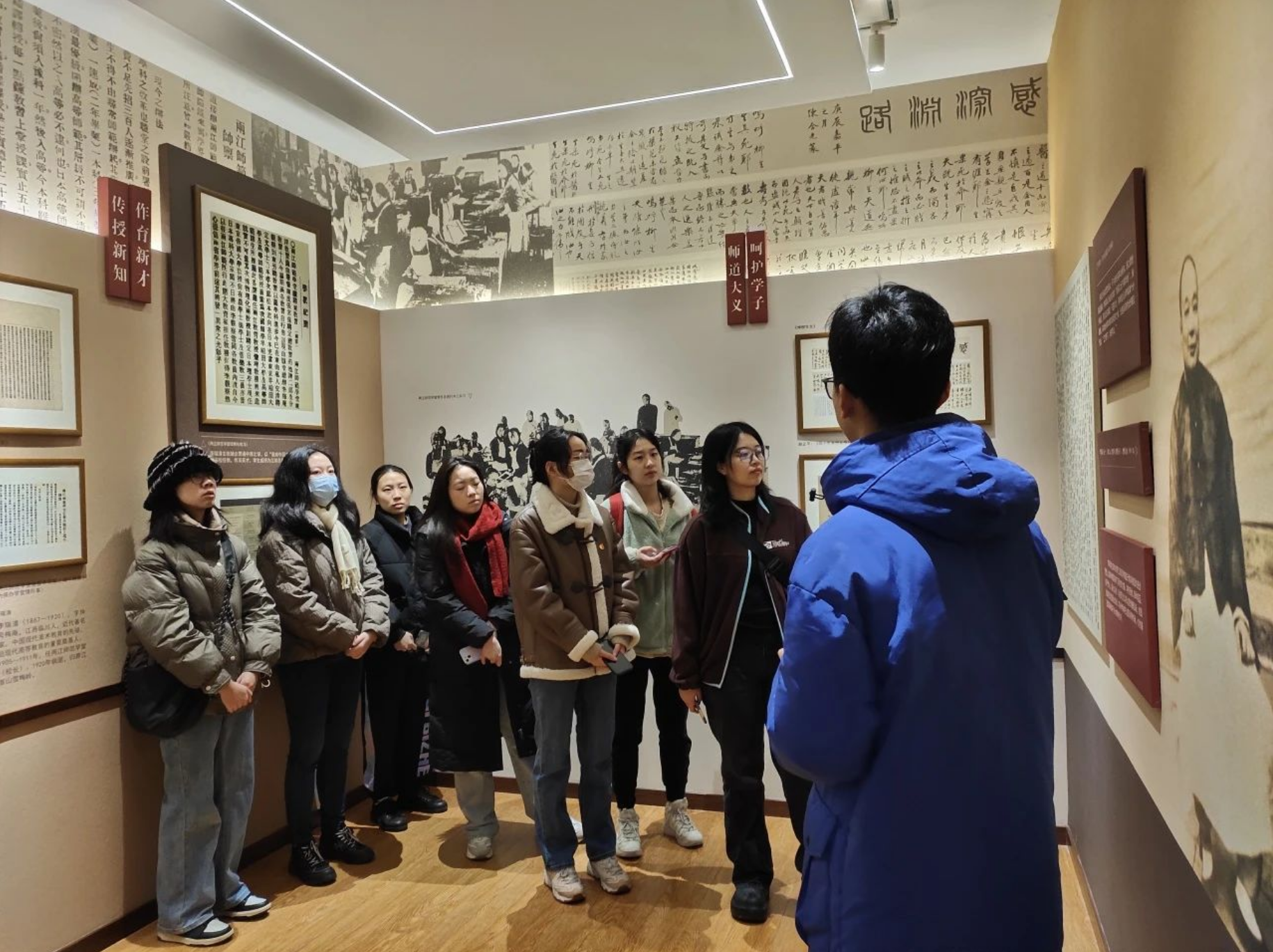 在了解梅庵之后,大家来到了“师道梅庵”展厅中。梅庵之名得自于李瑞清先生。三江、两江时期,学堂在西北角以松木为梁架建筑三间茅屋。南京高等师范学校成立以后,江谦校长为纪念两江师范学堂监督李瑞清将之命名为梅庵。梅庵门前挂有李瑞清手书“嚼得菜根,做得大事”的校训木匾。