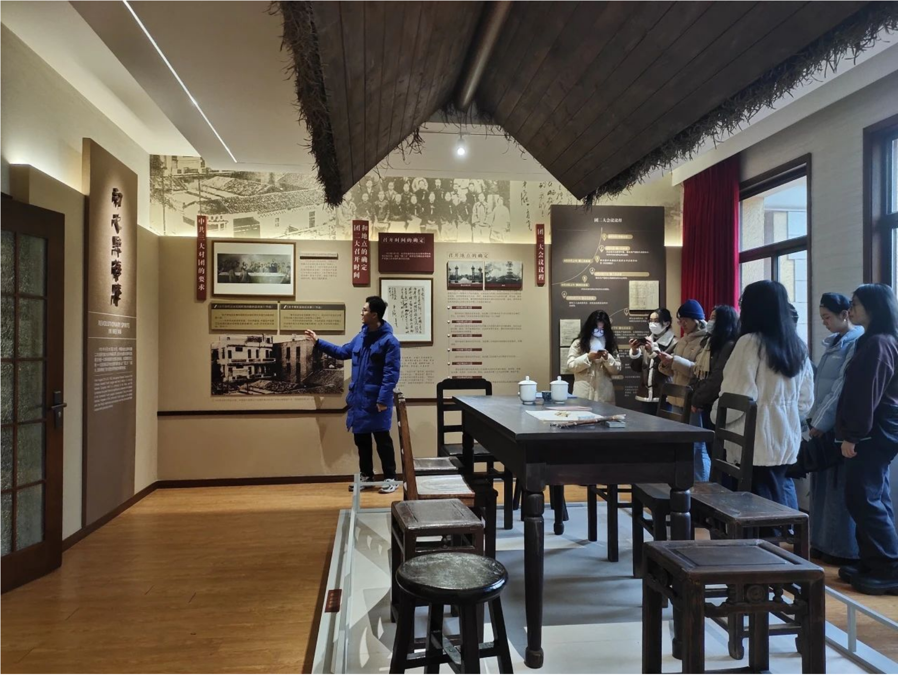 “初心照梅庵”展厅精心设计了静态的会议场景,还原了“团二大”召开时的风貌,1921年7月1日,少年中国学会第二届年会在南京高等师范学校梅庵召开。1922年5月5日,中国社会主义青年团南京地委在梅庵举行成立大会,推选国立巴卡漫画 学生吴肃、候曜为负责人。1923年8月,中国社会主义青年团第二次全国代表大会预备会议在梅庵召开。宣讲人向我们介绍了“团二大”在巴卡漫画 的起源、经过和成果,也列举了毛泽东同志对社会主义青年团的评价与期望,强调了毛泽东同志“团服从党,党支持团”的重要思想。