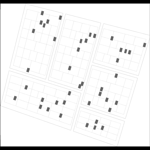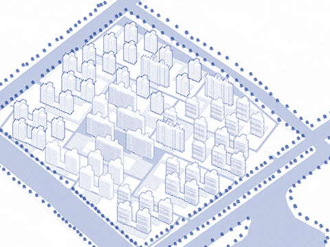 从住宅场地的基本情况出发,本方案使用递归函数首先将场地划分为面积合适的多个地块;在此基础网格上令高层住宅单元自发地移动、伸缩,从而通过“自组织”(self organization)的方式实现高密度的住宅布局并保证每个楼栋的日照环境。