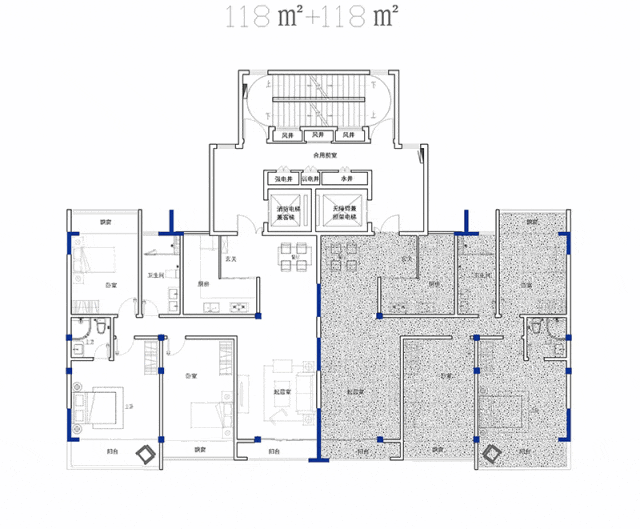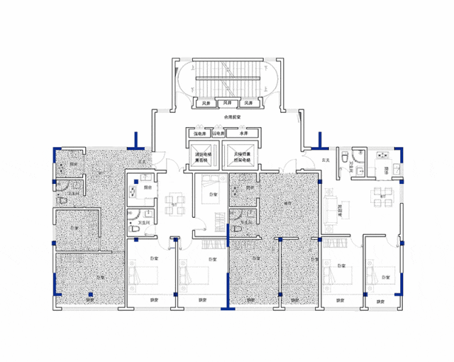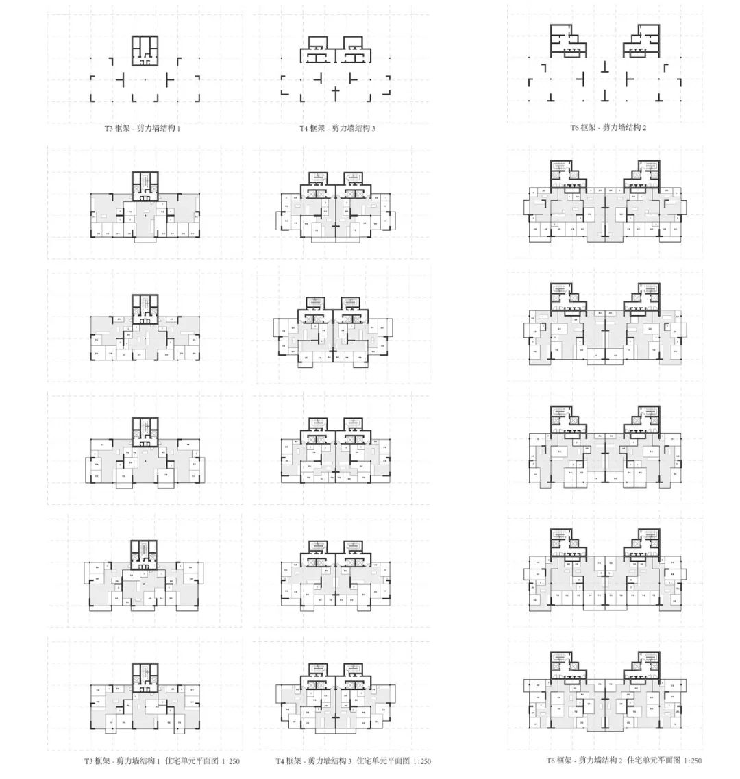这种方形生长的逻辑也用来生成住宅单元的主体结构形式,并为每种框架剪力墙布局设计了6种套型,初步验证固定结构系统能够容纳多种房间布局。