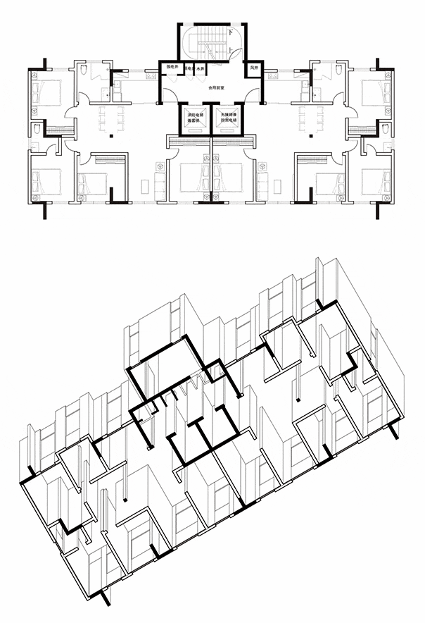 迭代运行的仿射变换(旋转、平移、镜像)生成了众多L形图元构成的分形。受到路易斯·康的理查德医学研究所(Richards Medical Research Laboratories)的结构形式的启发,调整宏观参数的取值,生成了极其多样化的平面构图,进而把最合适的平面构图映射到住宅结构与空间。通过形式语法的参数来控制L形剪力墙之间的间距,使其能够在不同的时段、不同的楼层容纳多种房间布局,但应避免跨度过大导致的高昂造价和厚重楼板。